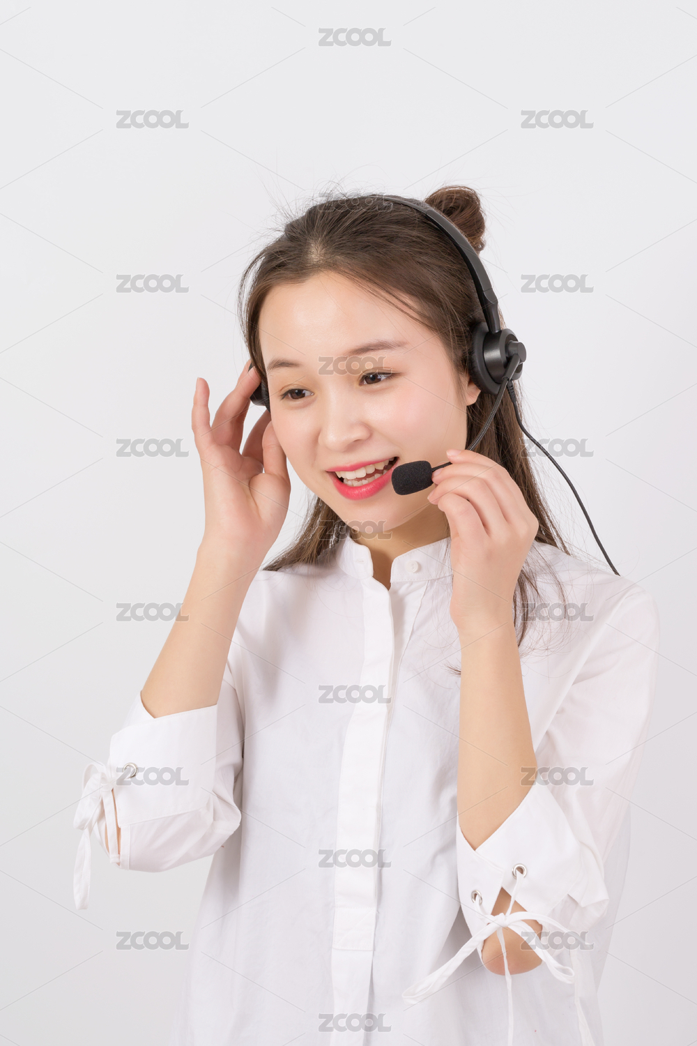 一位年輕美麗的女性客服戴著客服耳機(jī)微笑地服務(wù)顧客的疑問