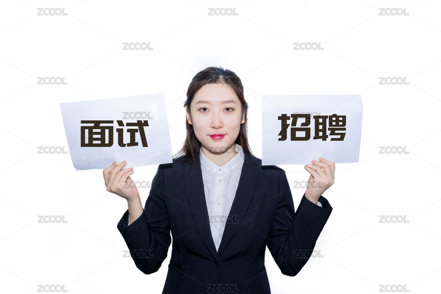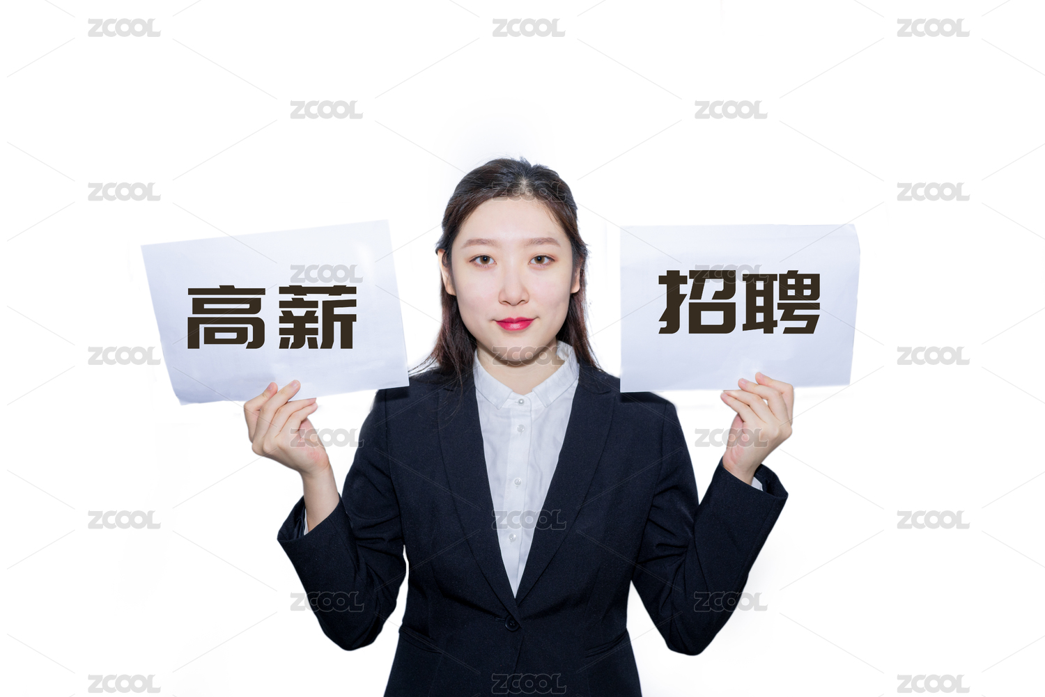 白色背景下一個(gè)中國女員工拿著招聘高薪升職入職的牌子