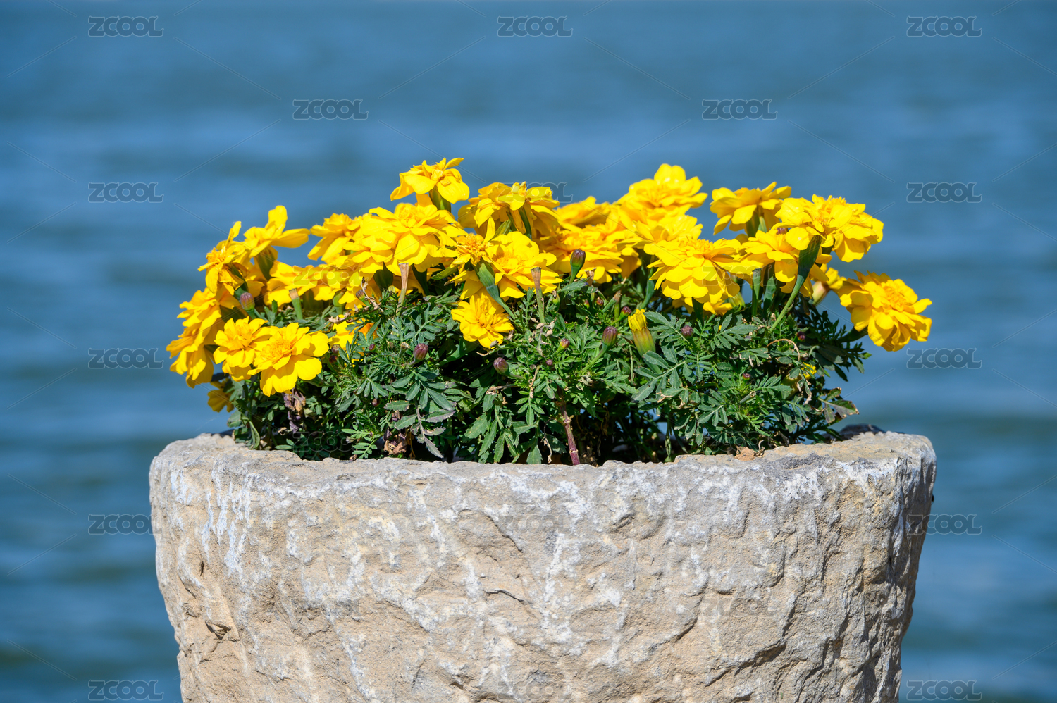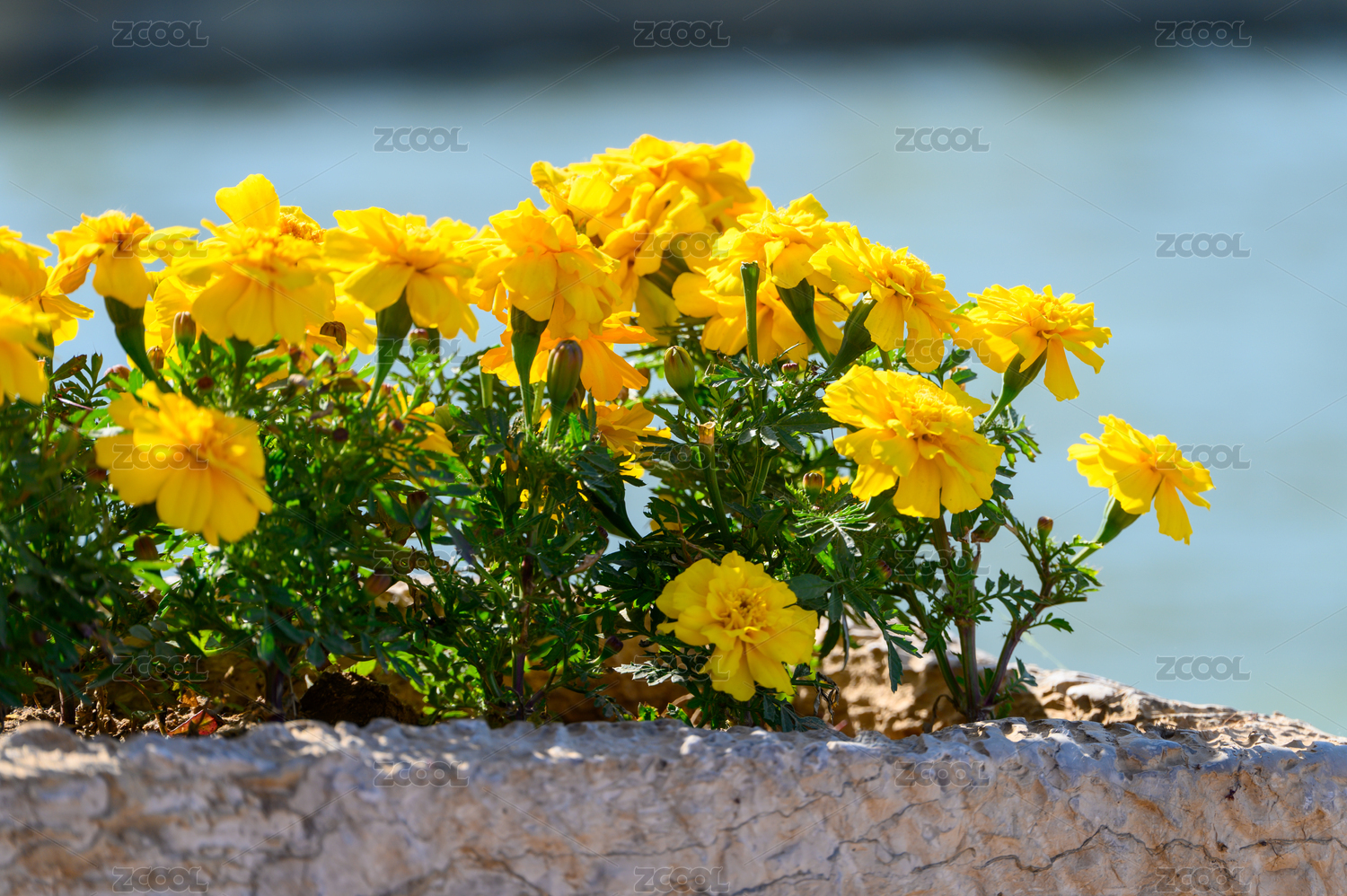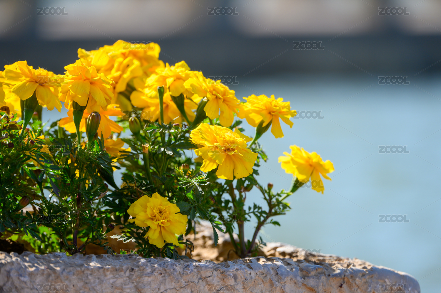 水岸邊明媚陽光下盛開的金黃色萬壽菊