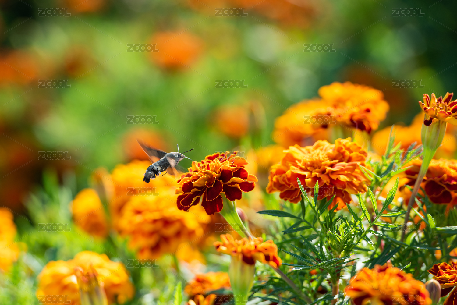 秋日公園里吸食萬壽菊花粉的蜂鳥蛾