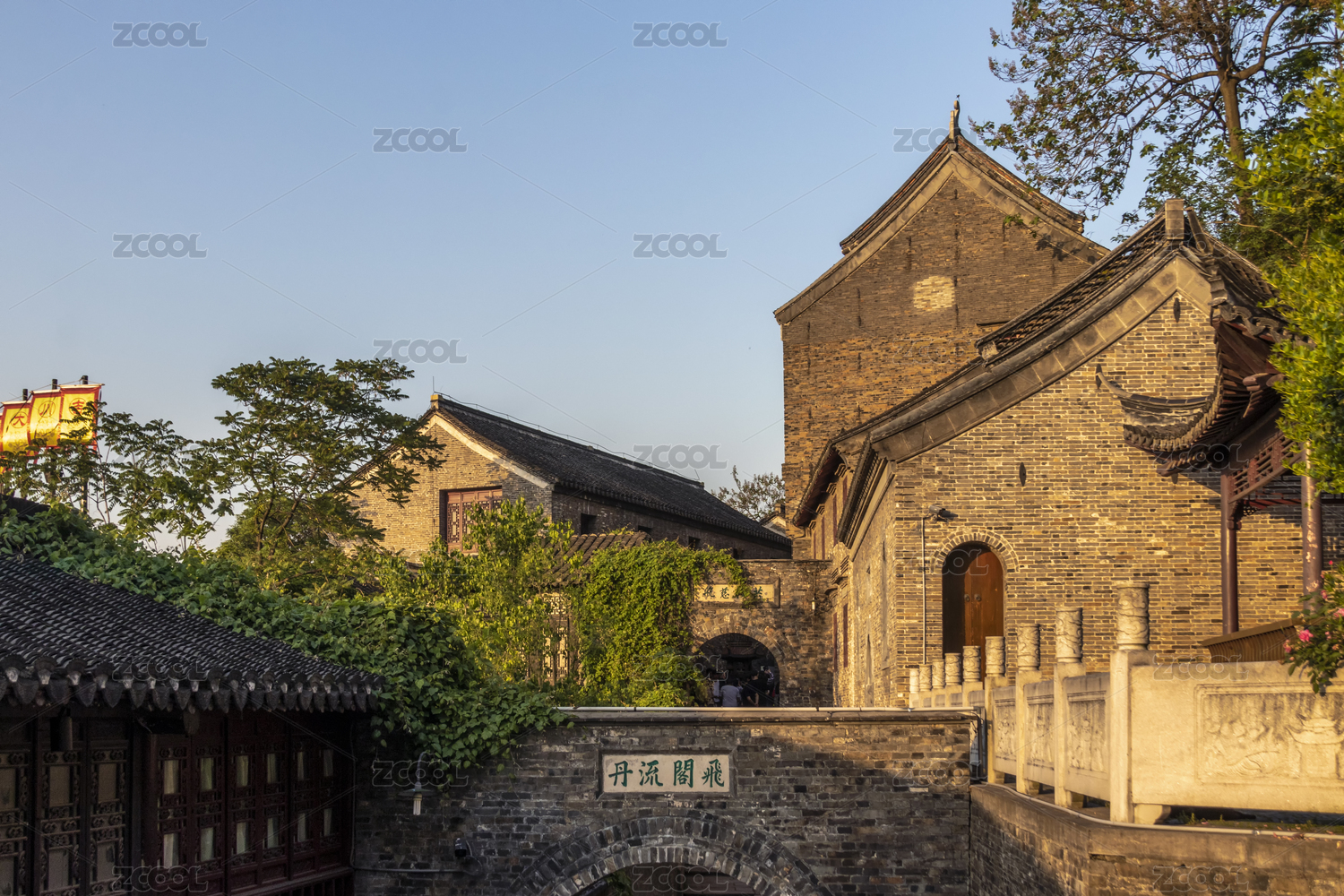 日落時夕陽下的中國江蘇省鎮(zhèn)江市長江西津古渡風景區(qū)建筑景觀