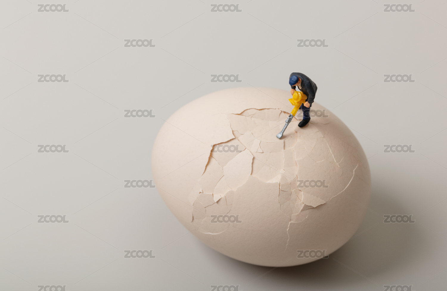 微縮創(chuàng)意站在雞蛋上用電鉆破殼的工人
