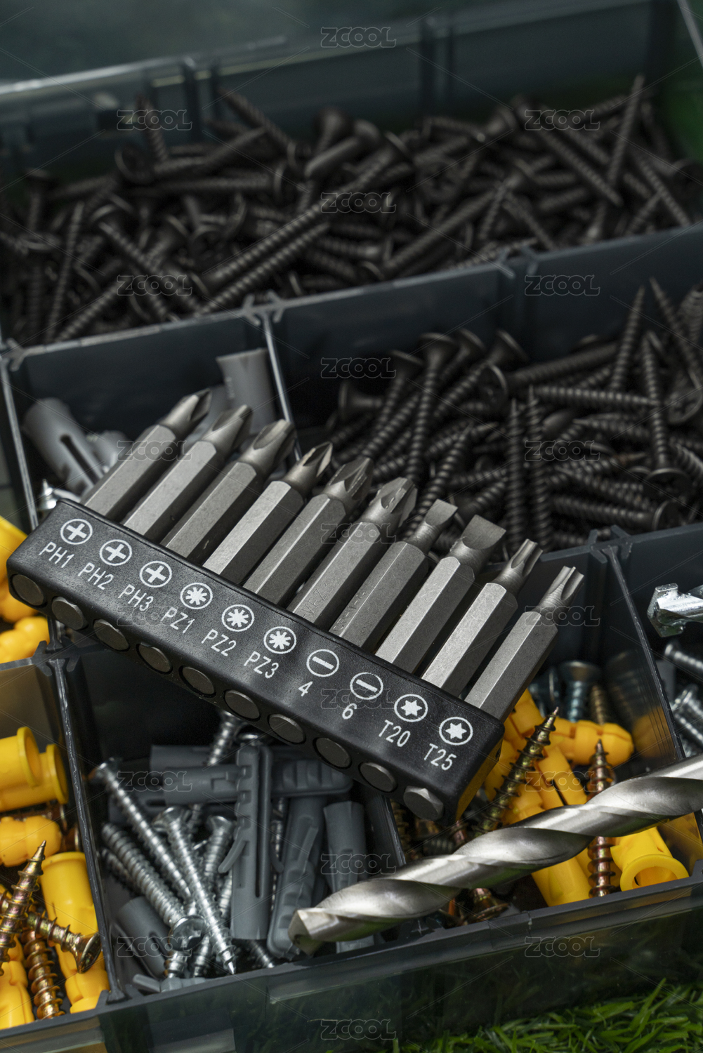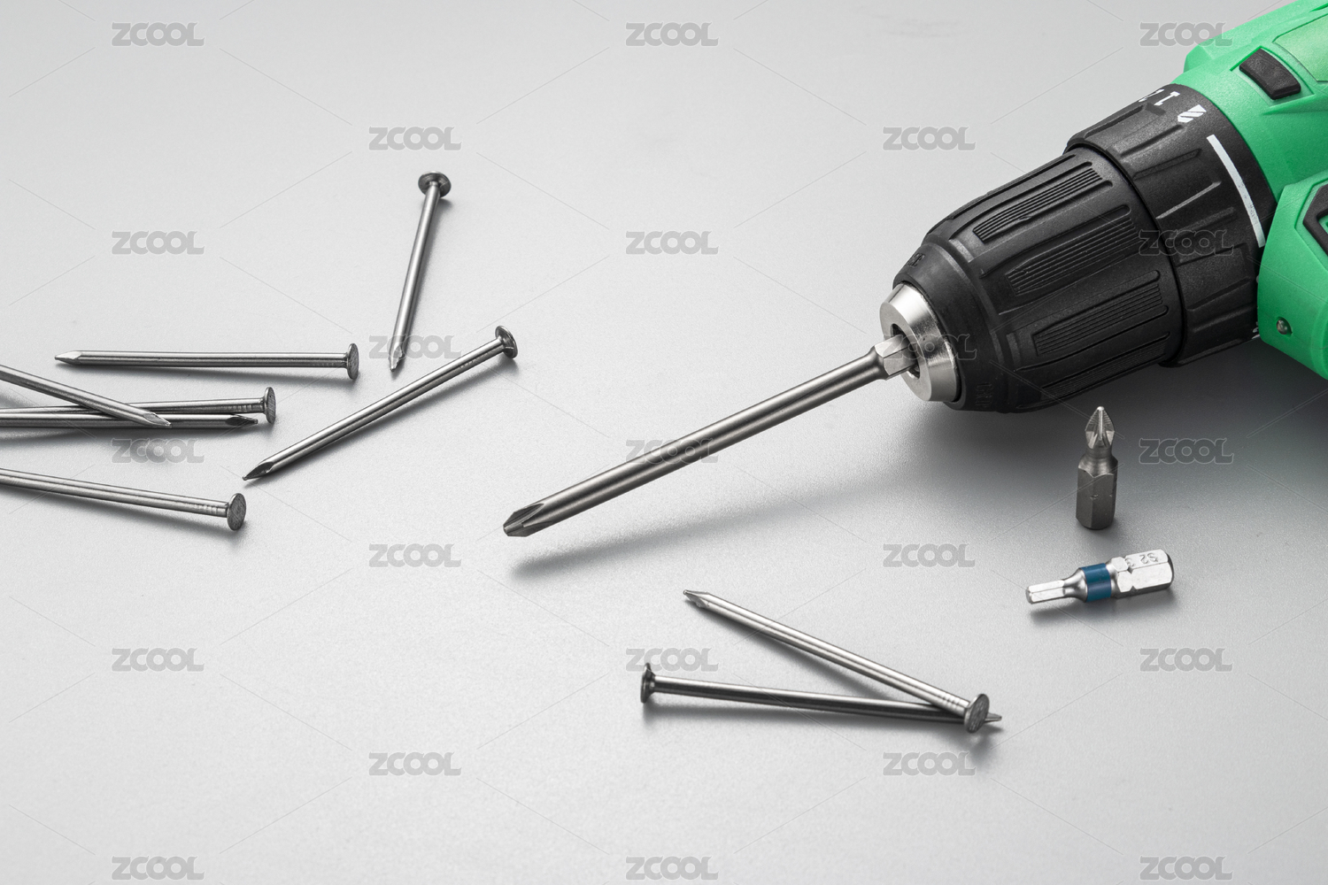 灰色桌面上的五金工具電鉆螺絲刀和釘子
