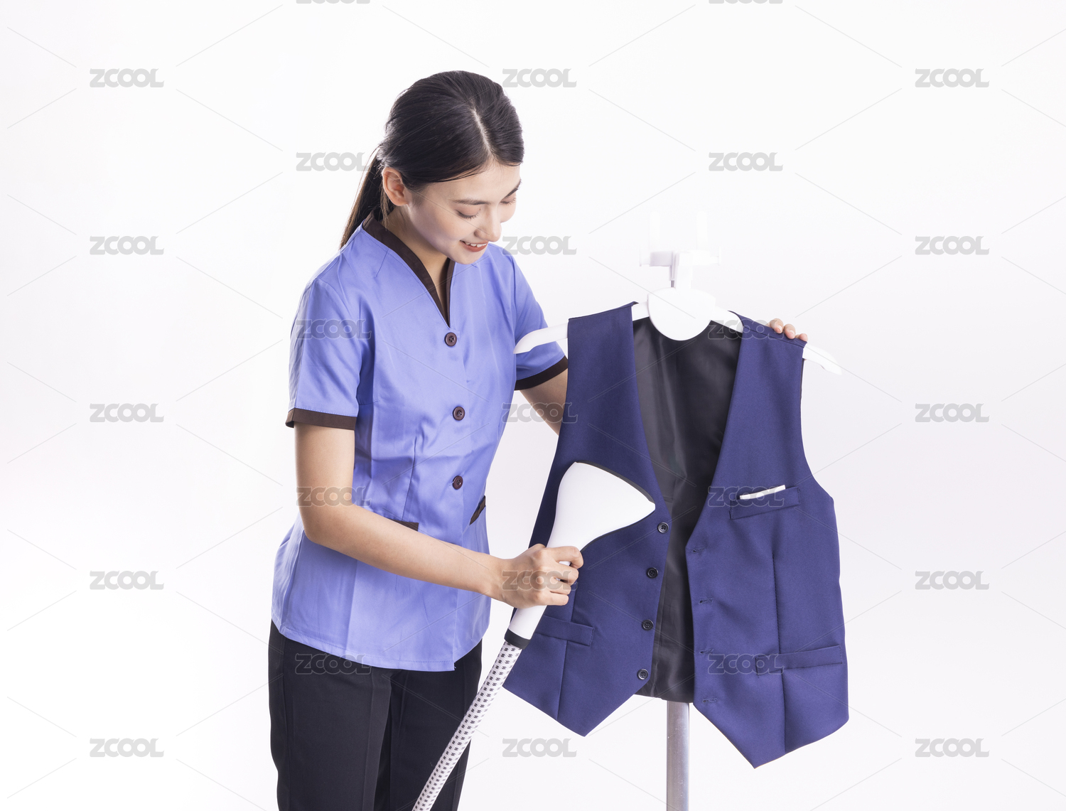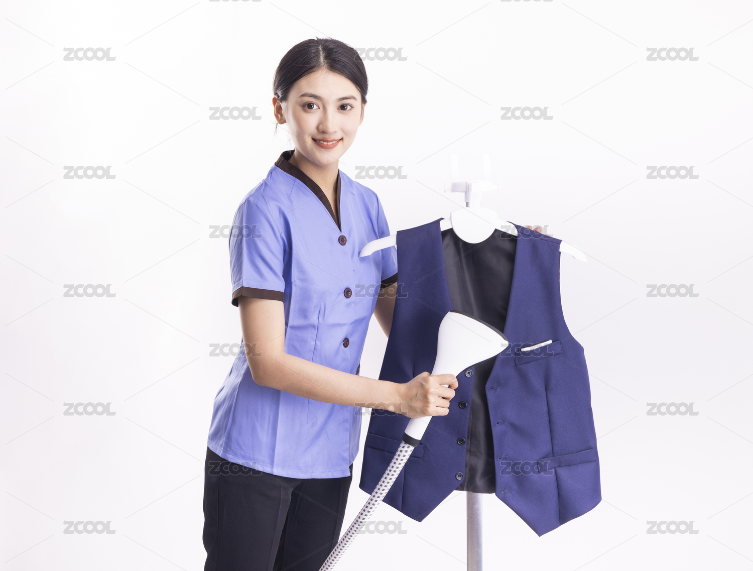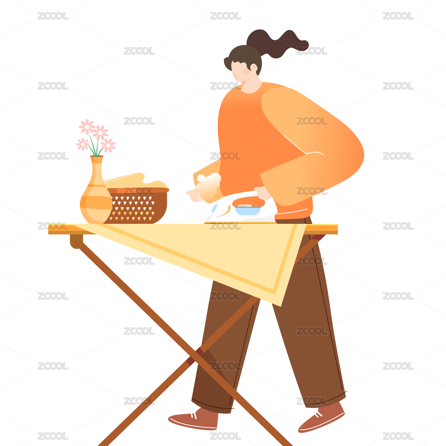 白色背景里在熨衣服的家政女性