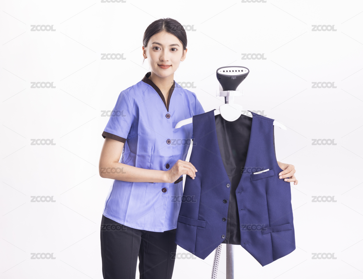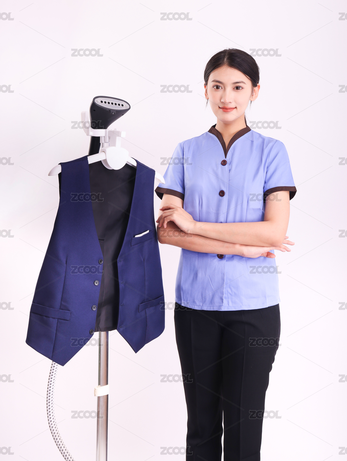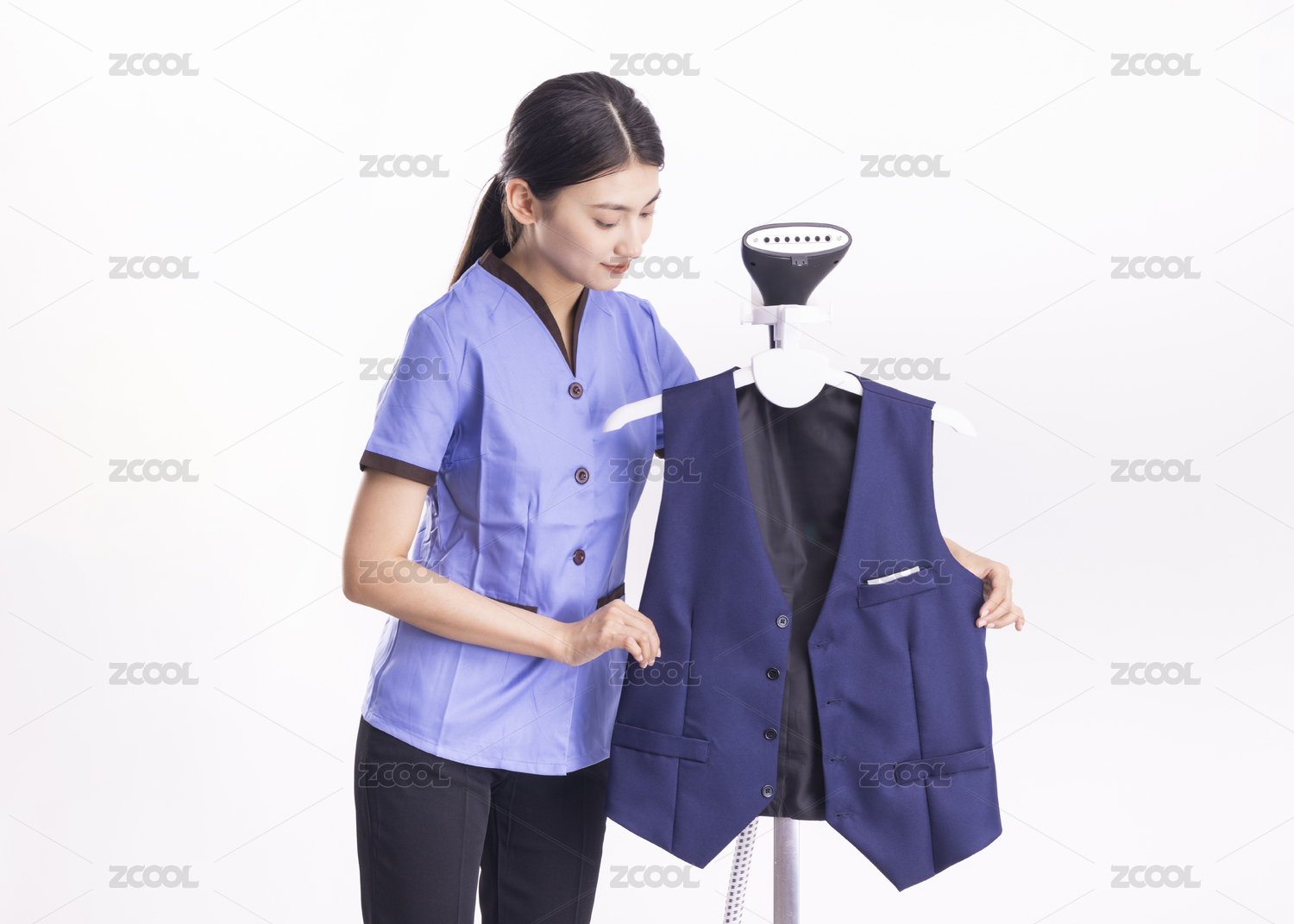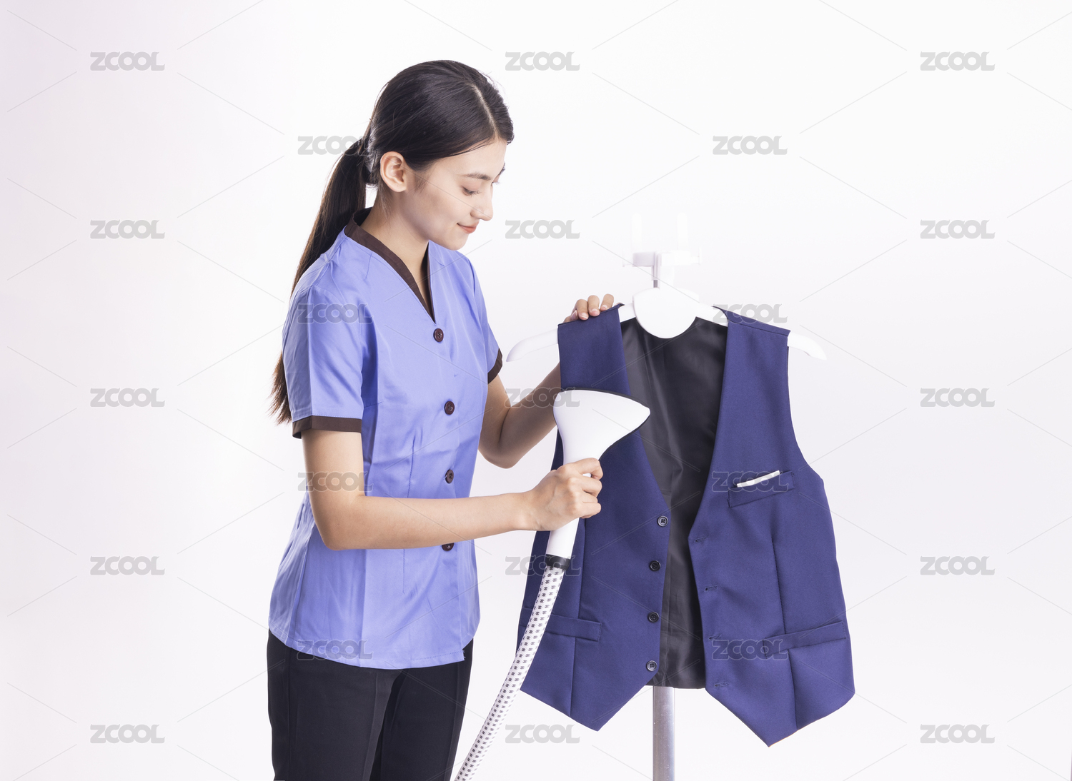 白色背景里在熨衣服的家政女性