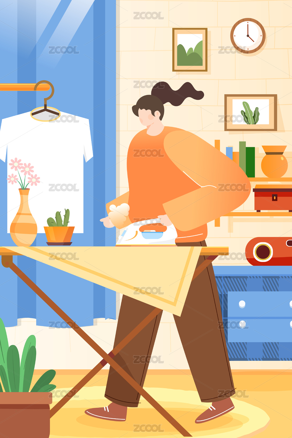 一個女孩在熨衣服矢量插畫