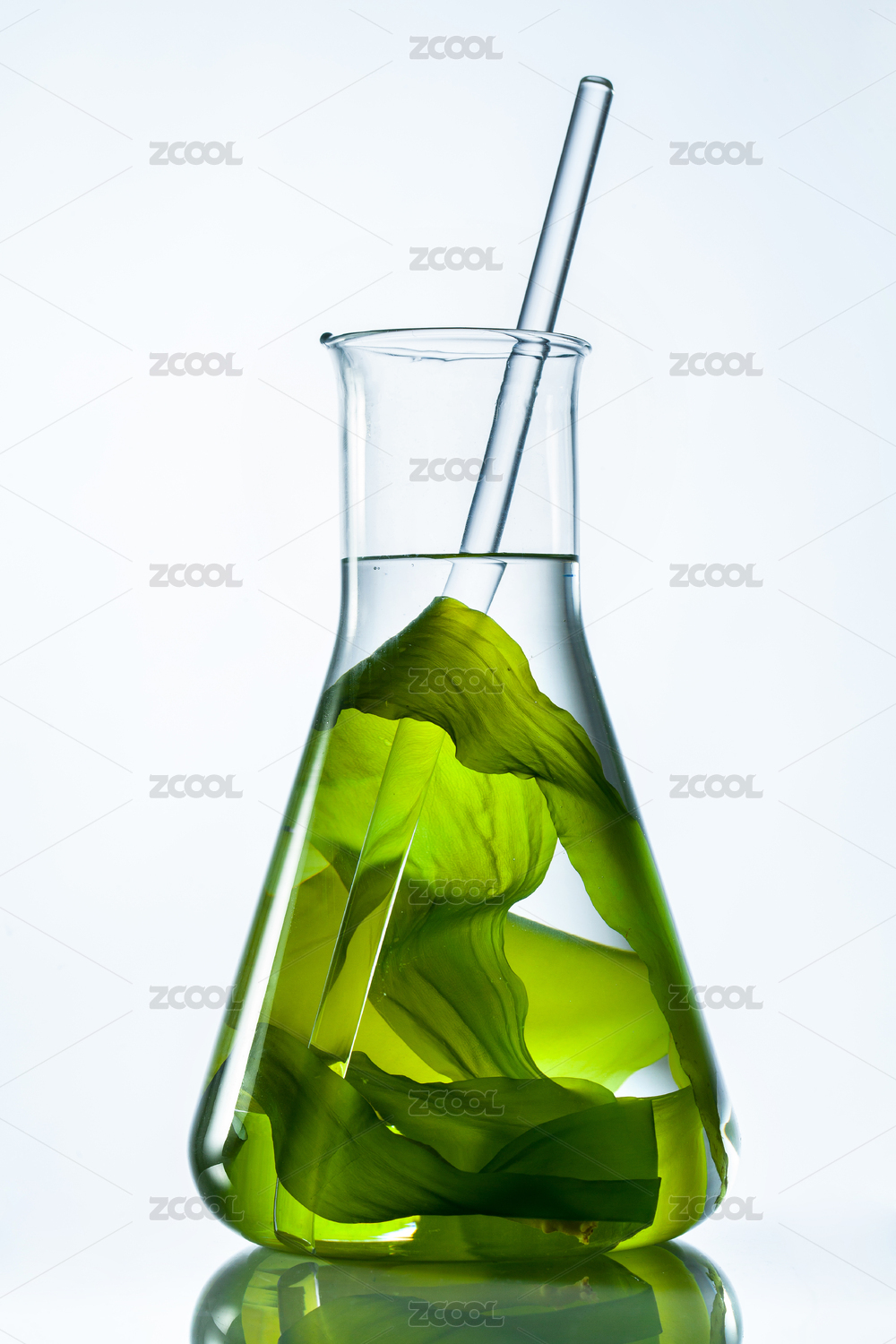 綠色背景中的燒瓶和海藻特寫(xiě)