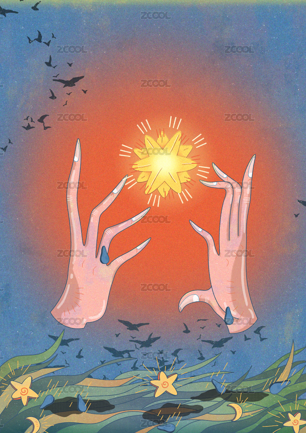 樹下落葉落花女孩捧著花扁平肌理插畫
