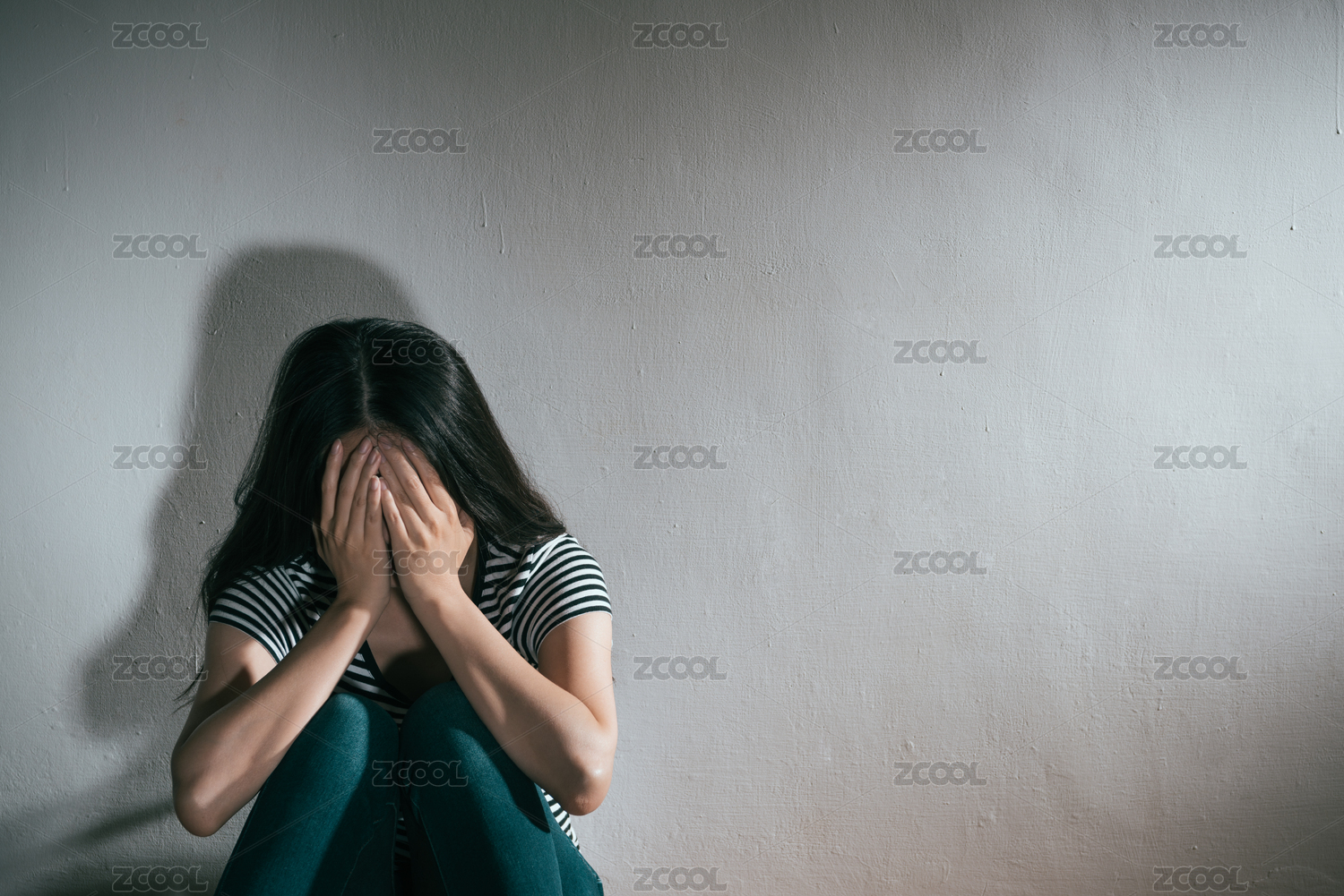 悲傷的女人雙手捂著臉蹲坐在地板上