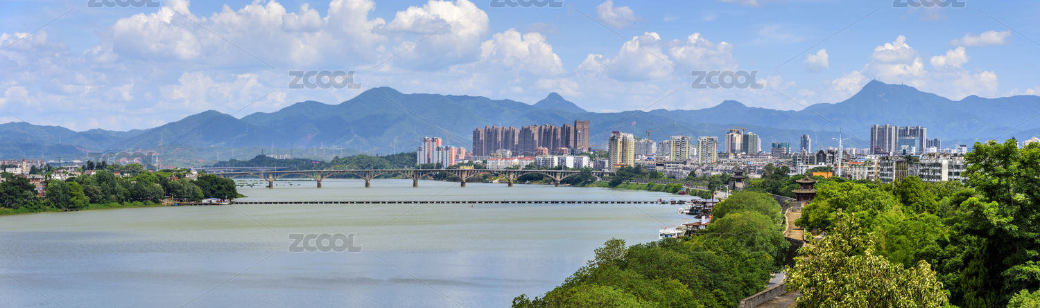 江西省贛州市夜晚月亮光照贛江外灘高樓建筑
