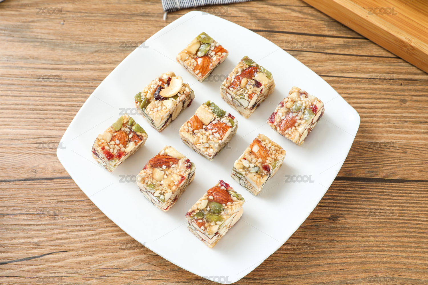 白色的盤子里裝著堅果酥糖麻糖堅果能量棒