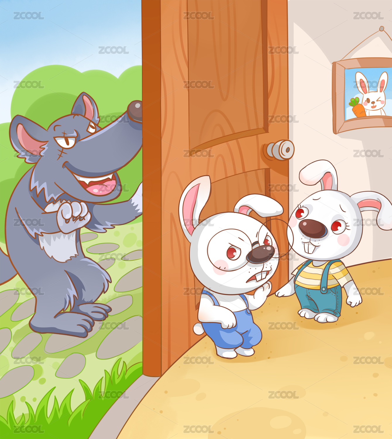 兩小兔子在家碰上大灰狼在門口叫門