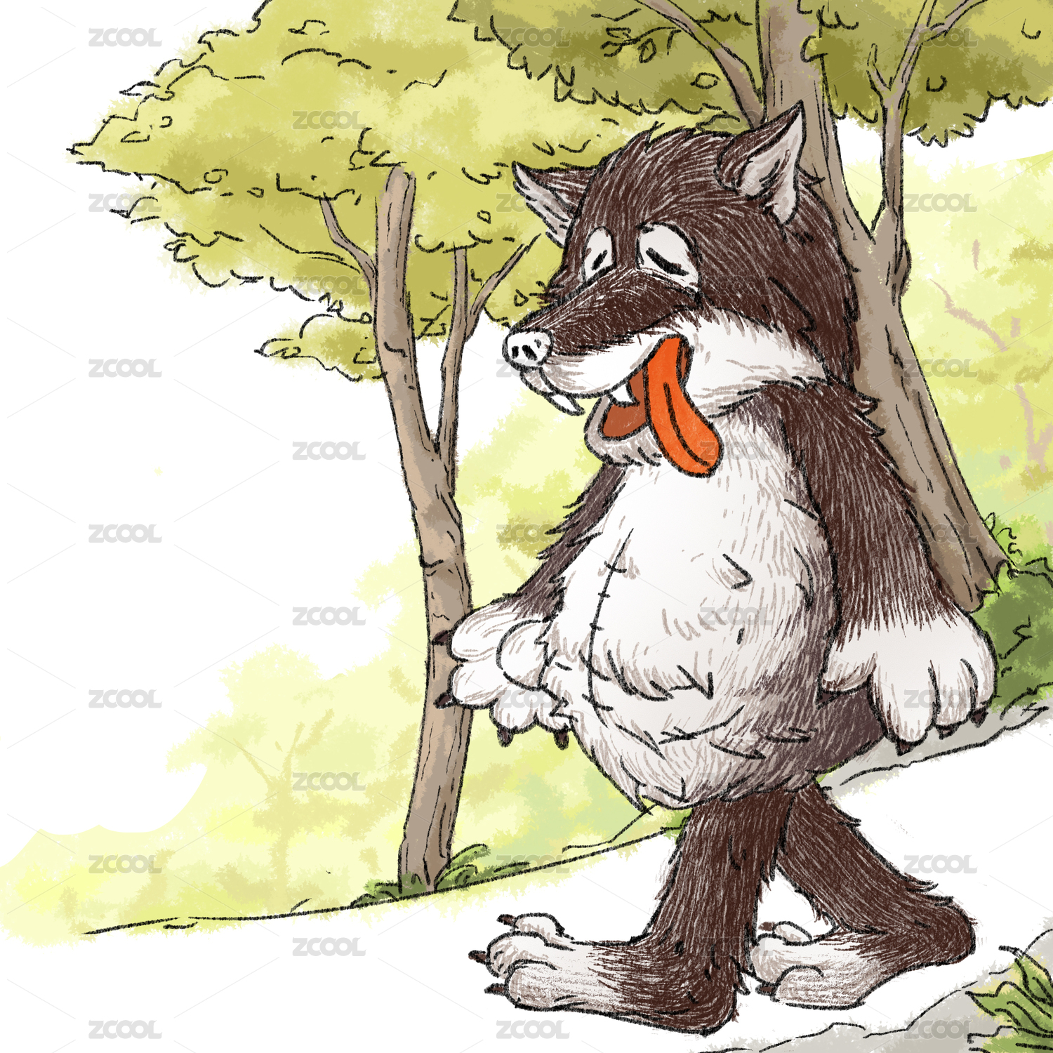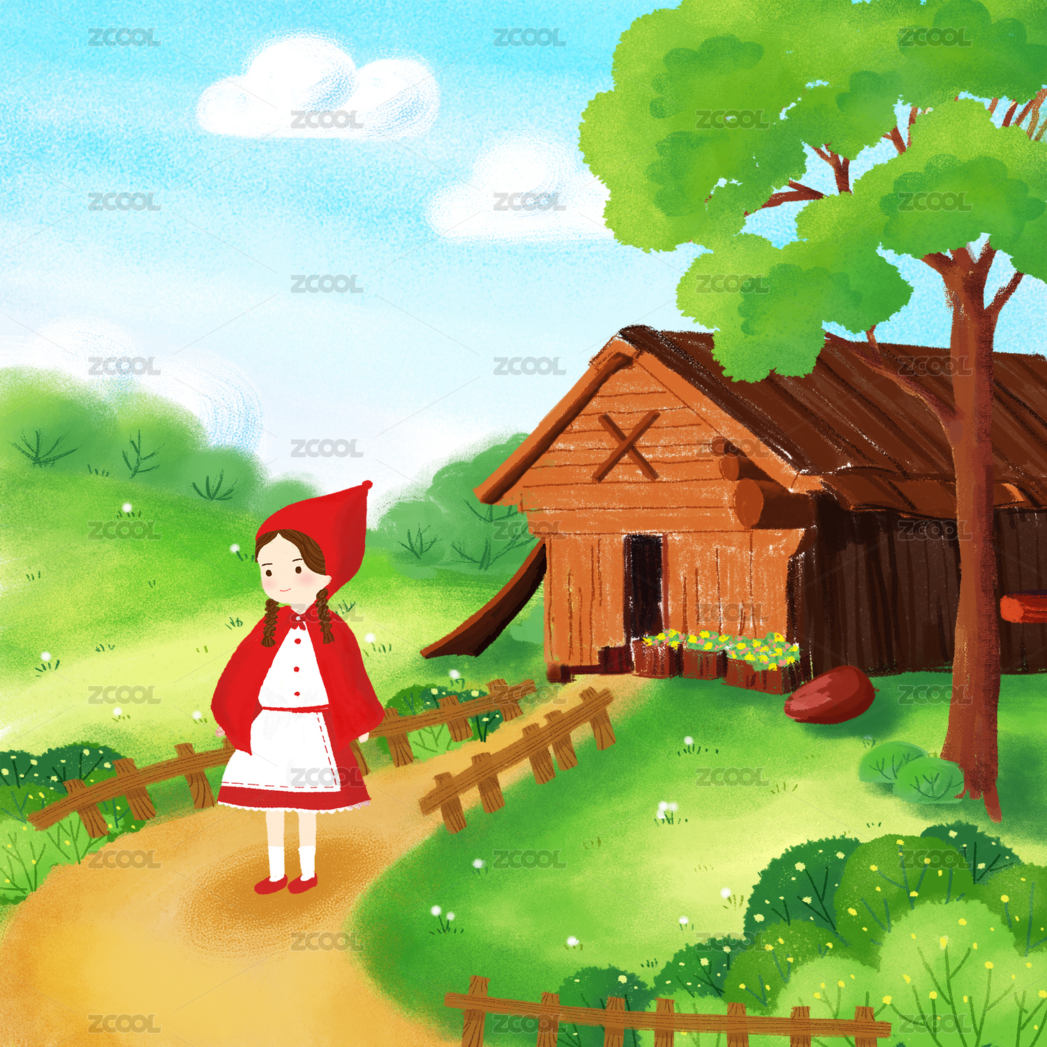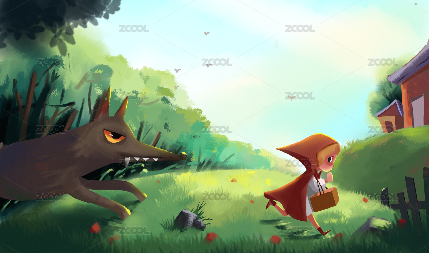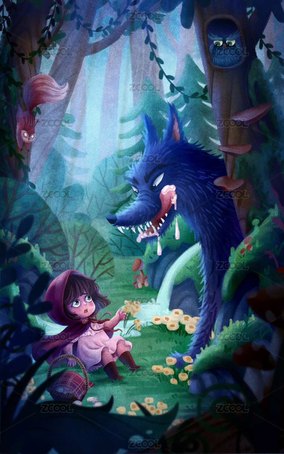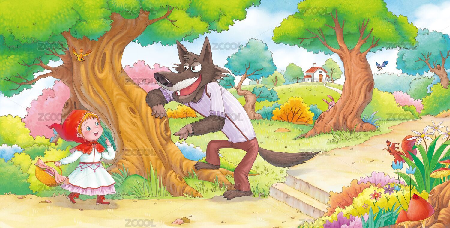 手繪故事森林小紅帽大灰狼插畫