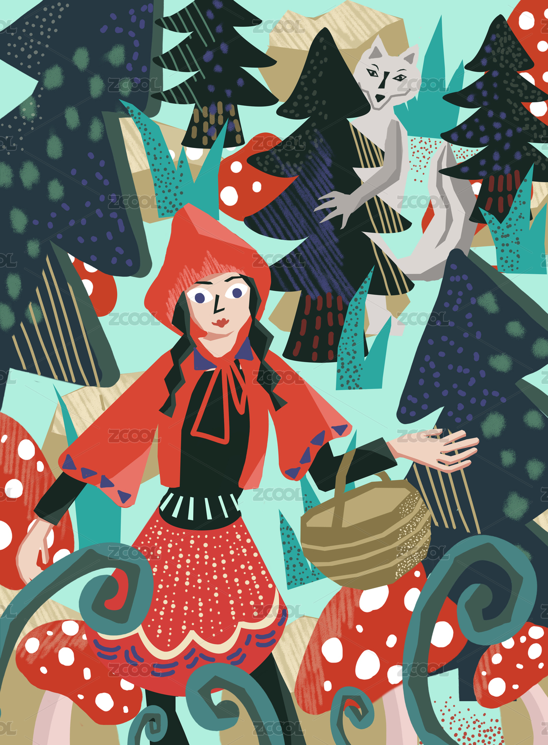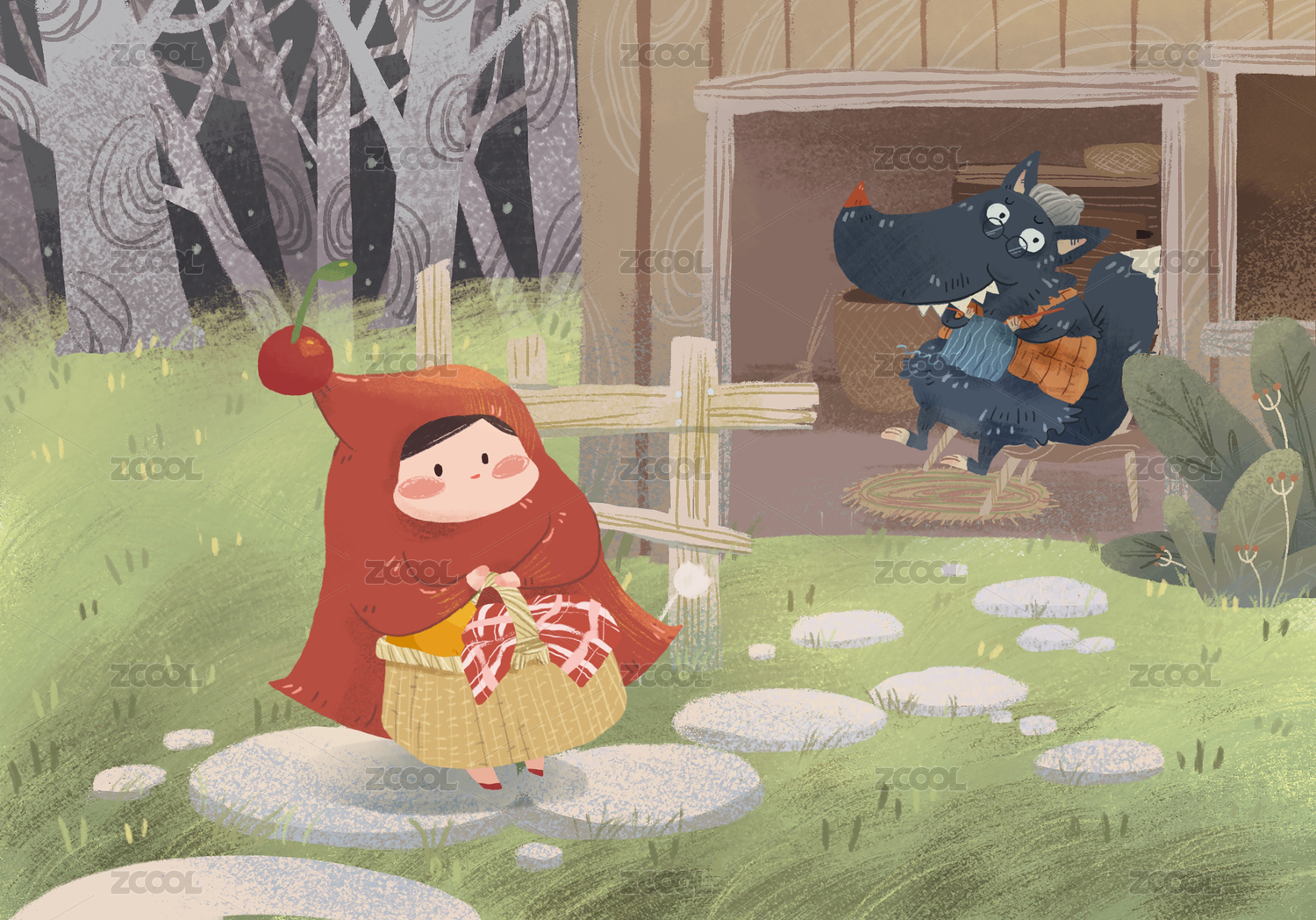 兒童故事童話小紅帽與大灰狼肌理插畫
