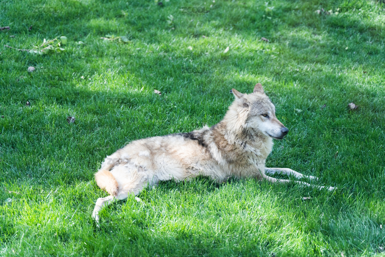 灰狼在綠草地上休息