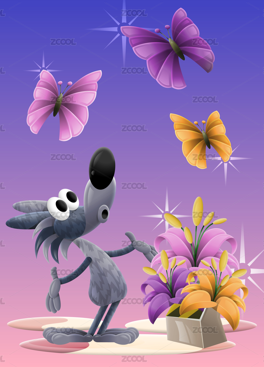大灰狼蝴蝶百合花夢幻場景插畫