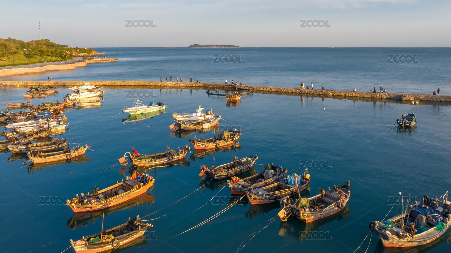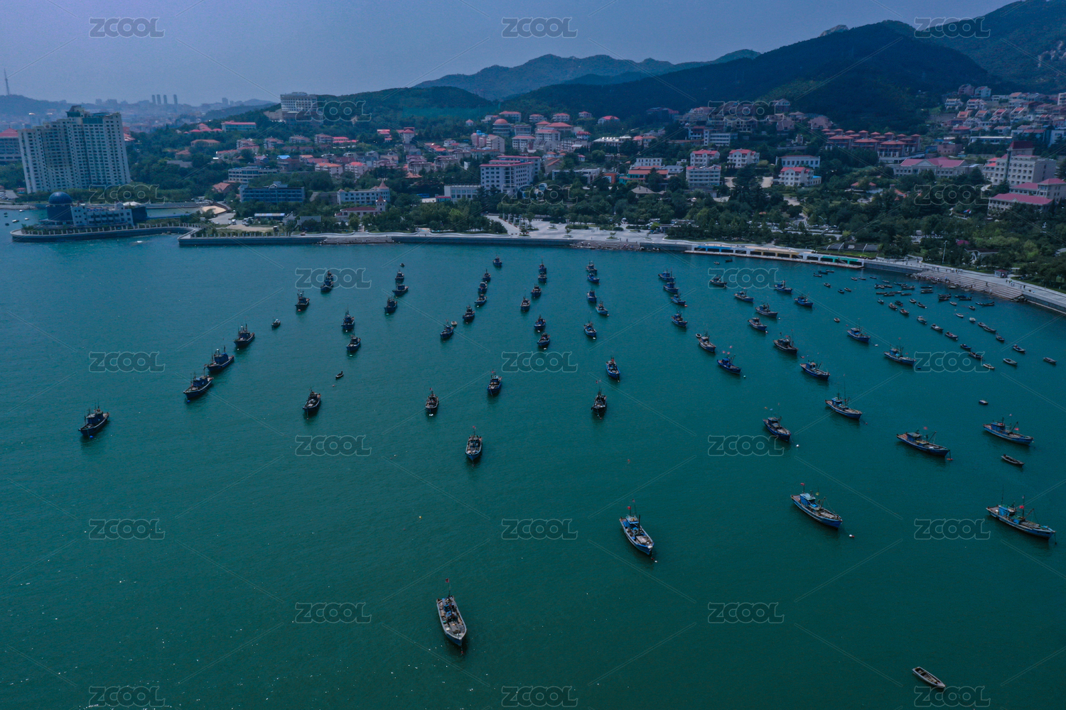 航拍山東威海海源公園港灣里的漁船