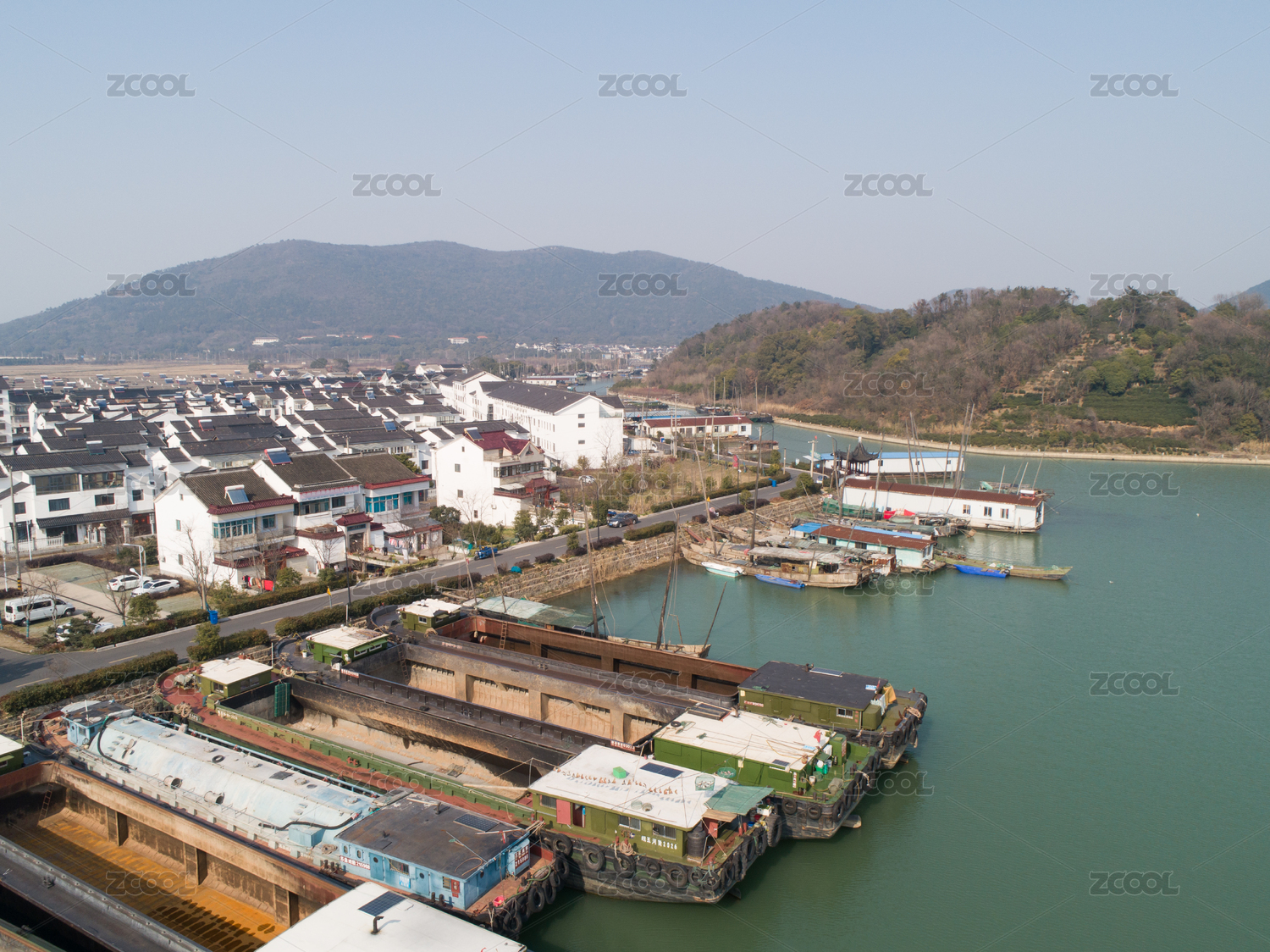 航拍蘇州太湖漁港村,漁船停泊在港灣里