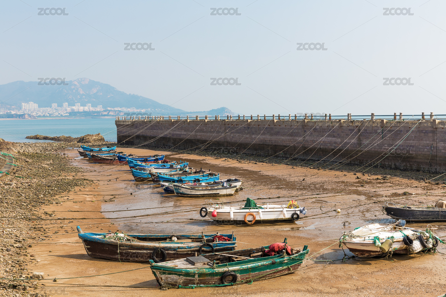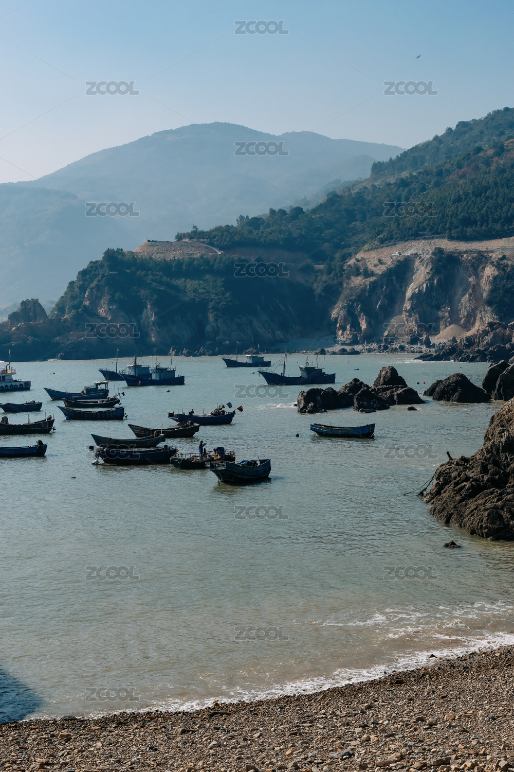 藍(lán)天山邊港灣里停泊的漁船