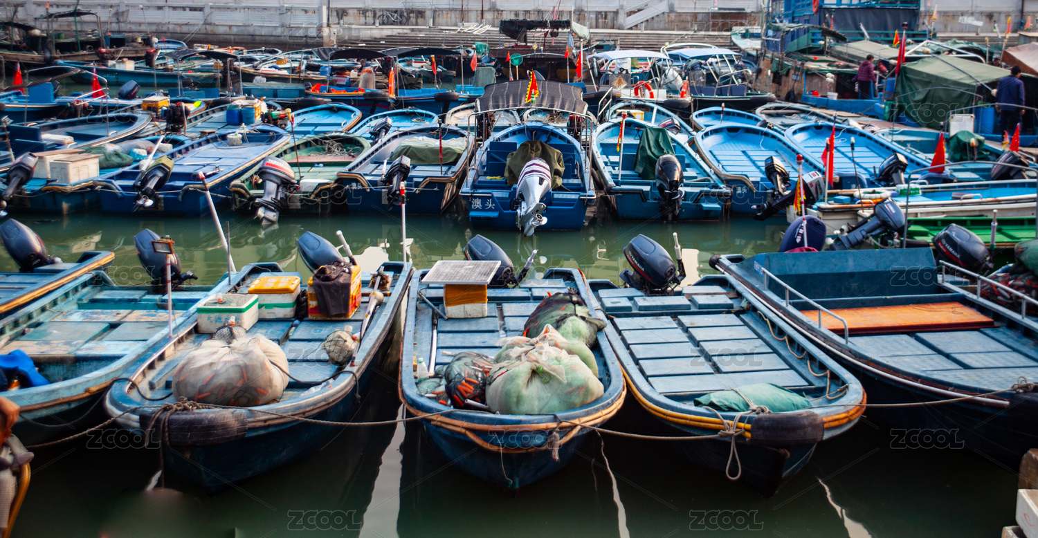 海邊港灣多條并排漁船歸來滿載而歸的小船