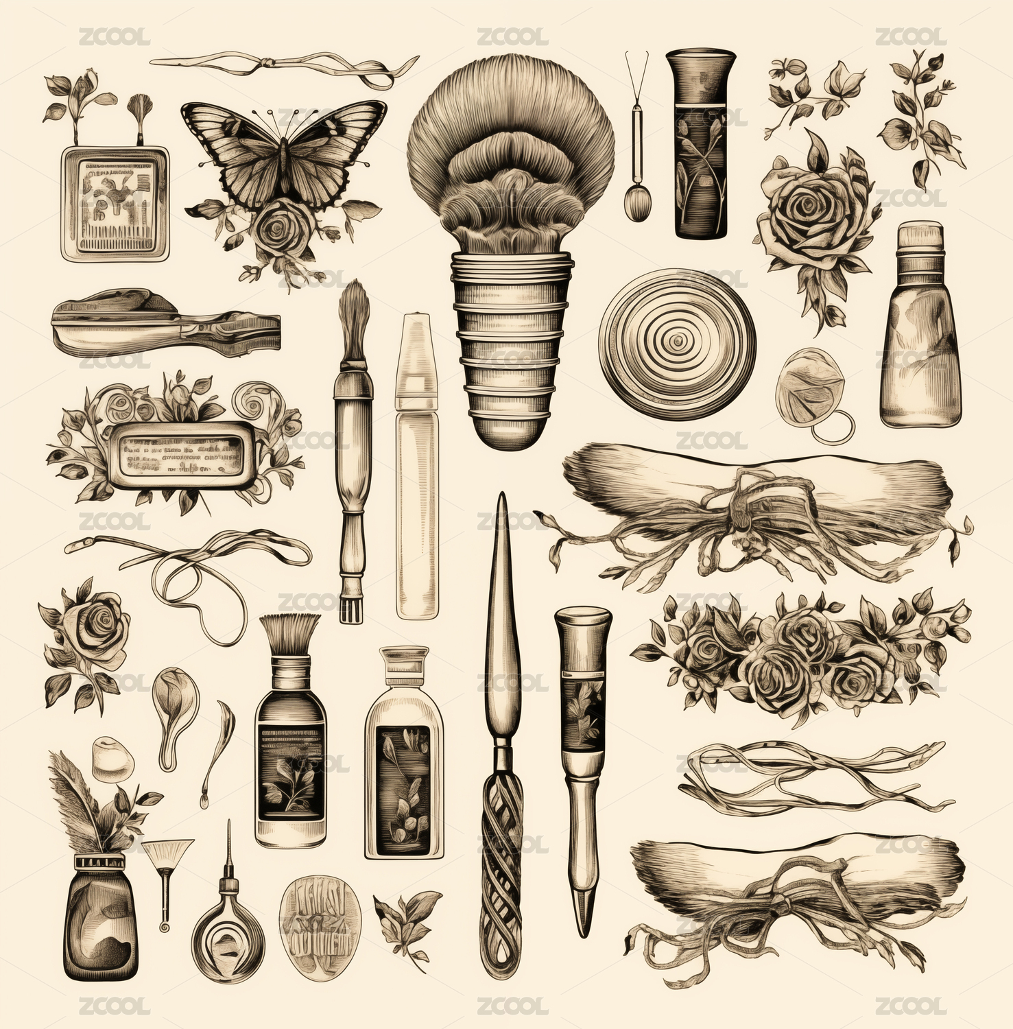 復(fù)古時(shí)尚Vintage手繪理容美容工具圖