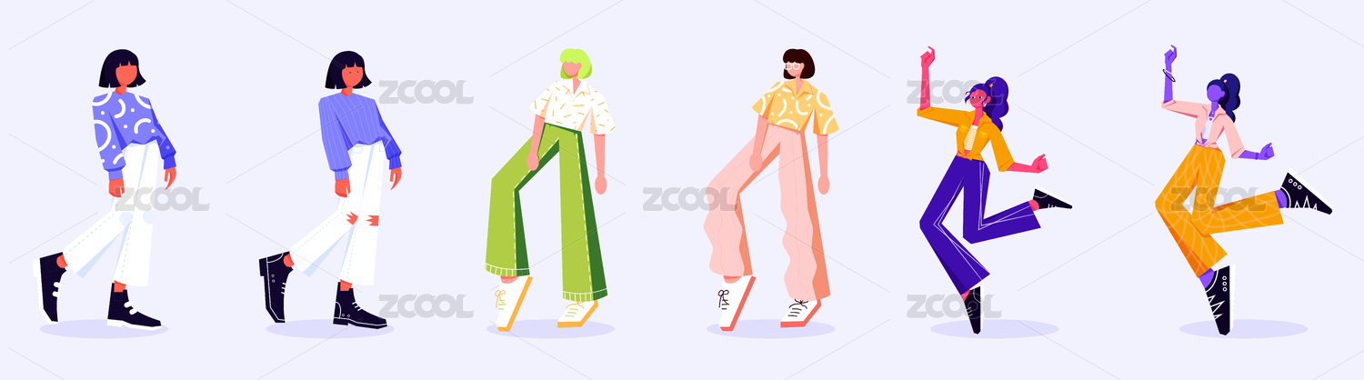 潮流人物女生站立姿勢(shì)扁平插畫圖組