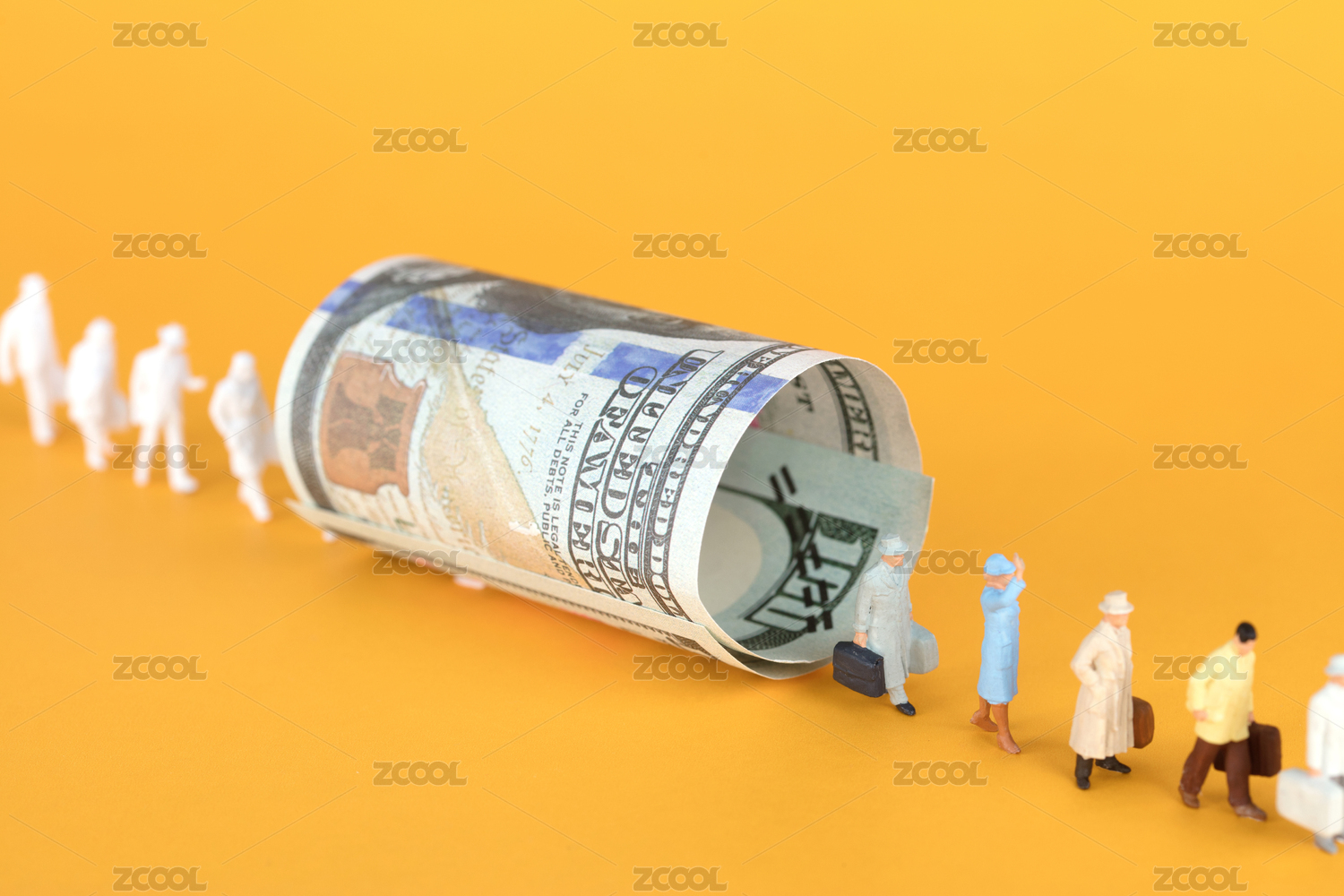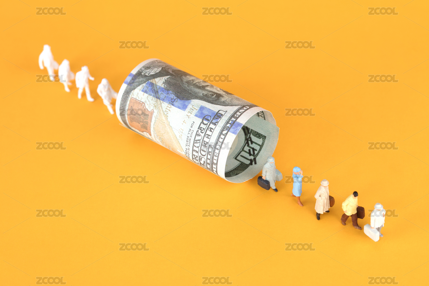一堆白模人物通過(guò)卷著的美元鈔票變成彩色模