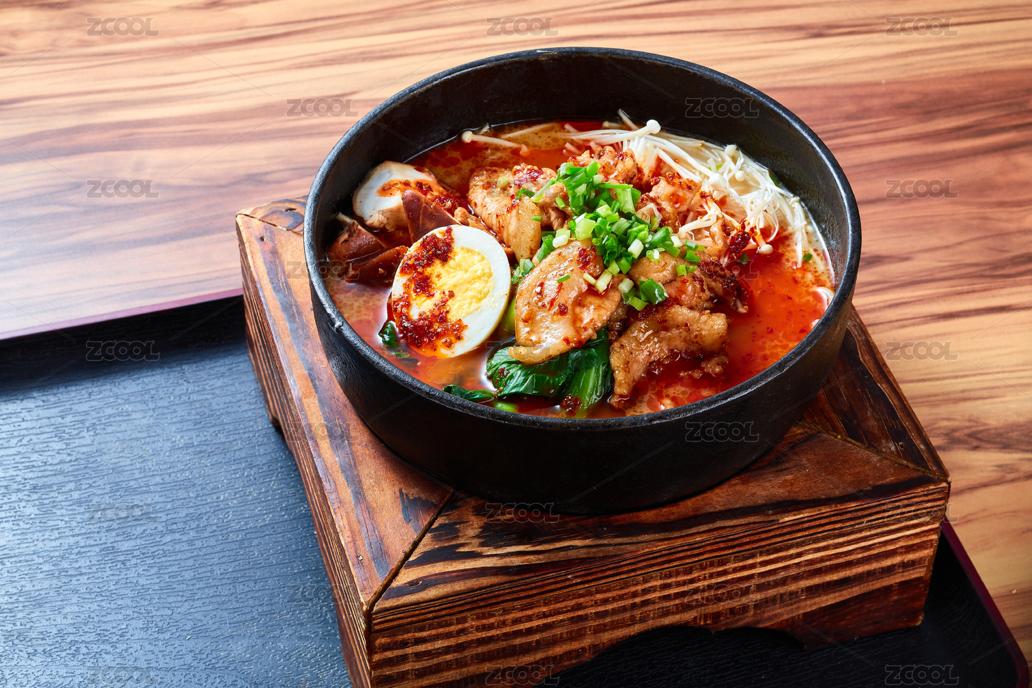 一碗石鍋中的美味日式辣白菜豬肉烏冬面在木質(zhì)托盤上