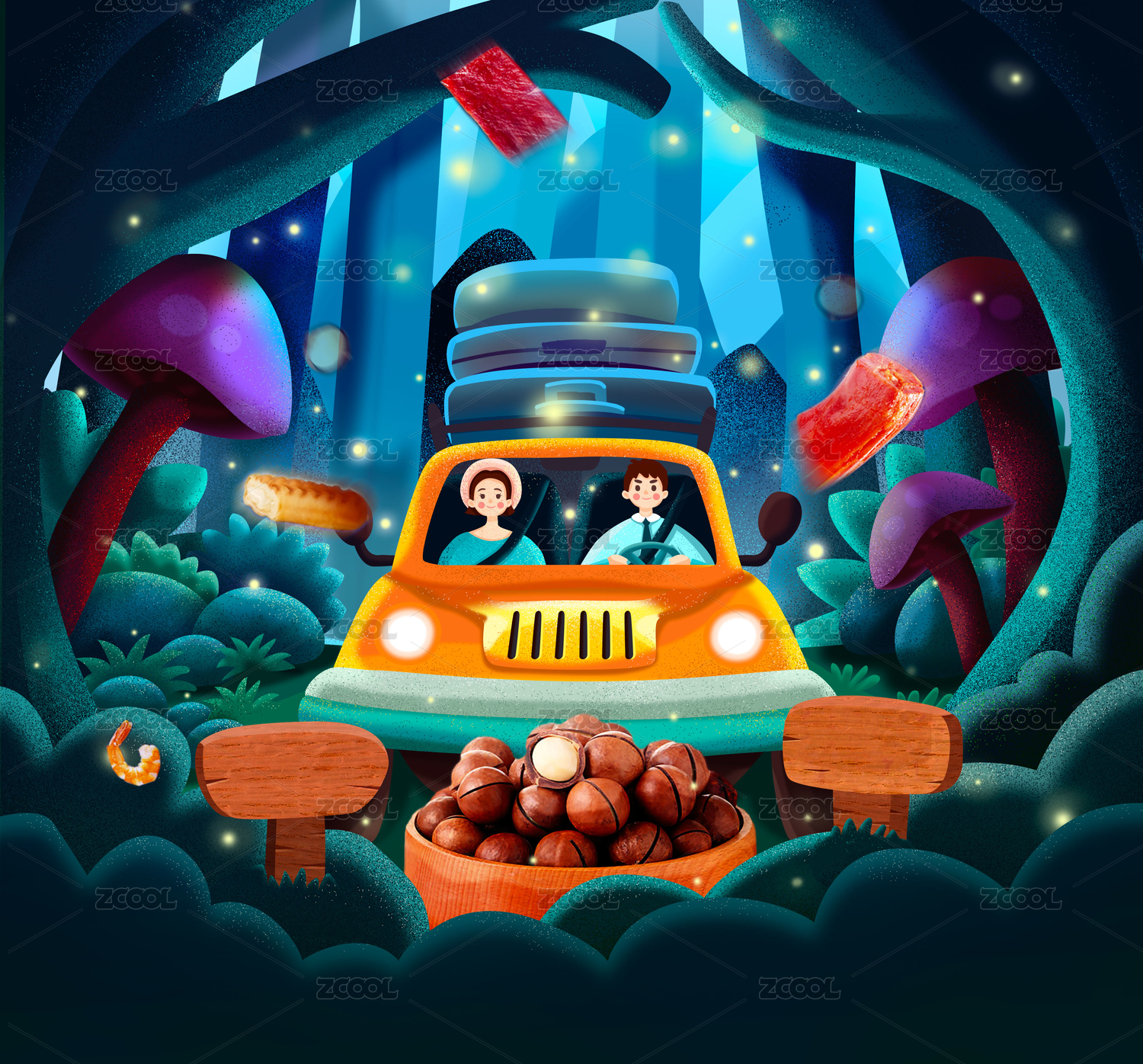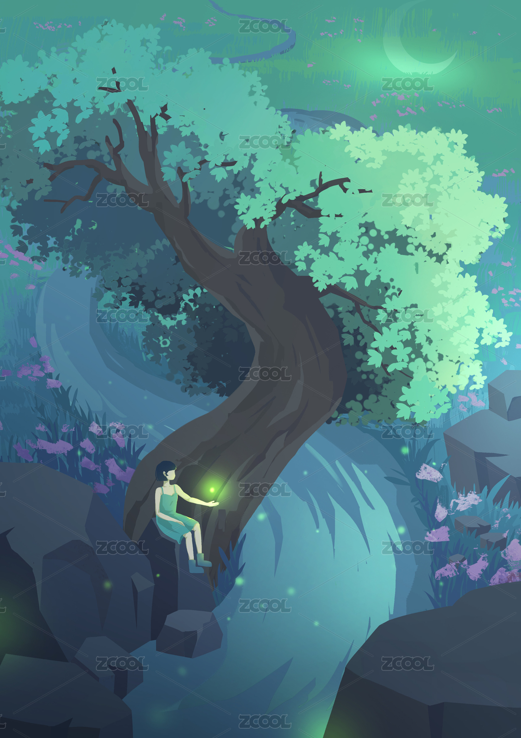 森林夜晚星空河流螢火蟲神秘寧靜唯美插畫
