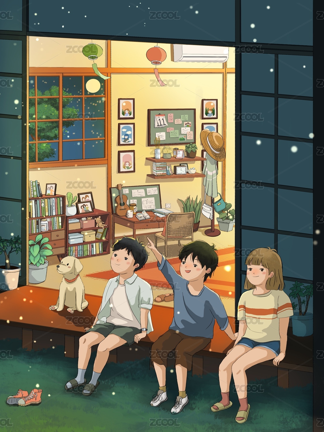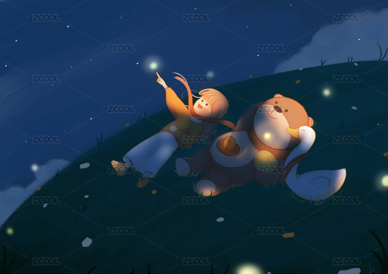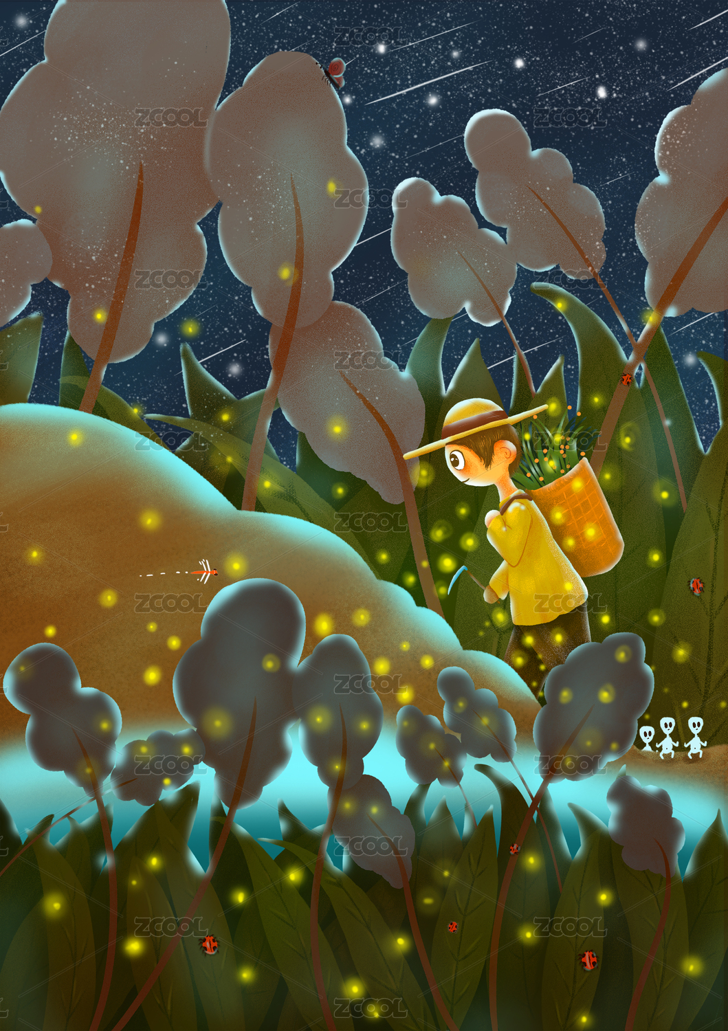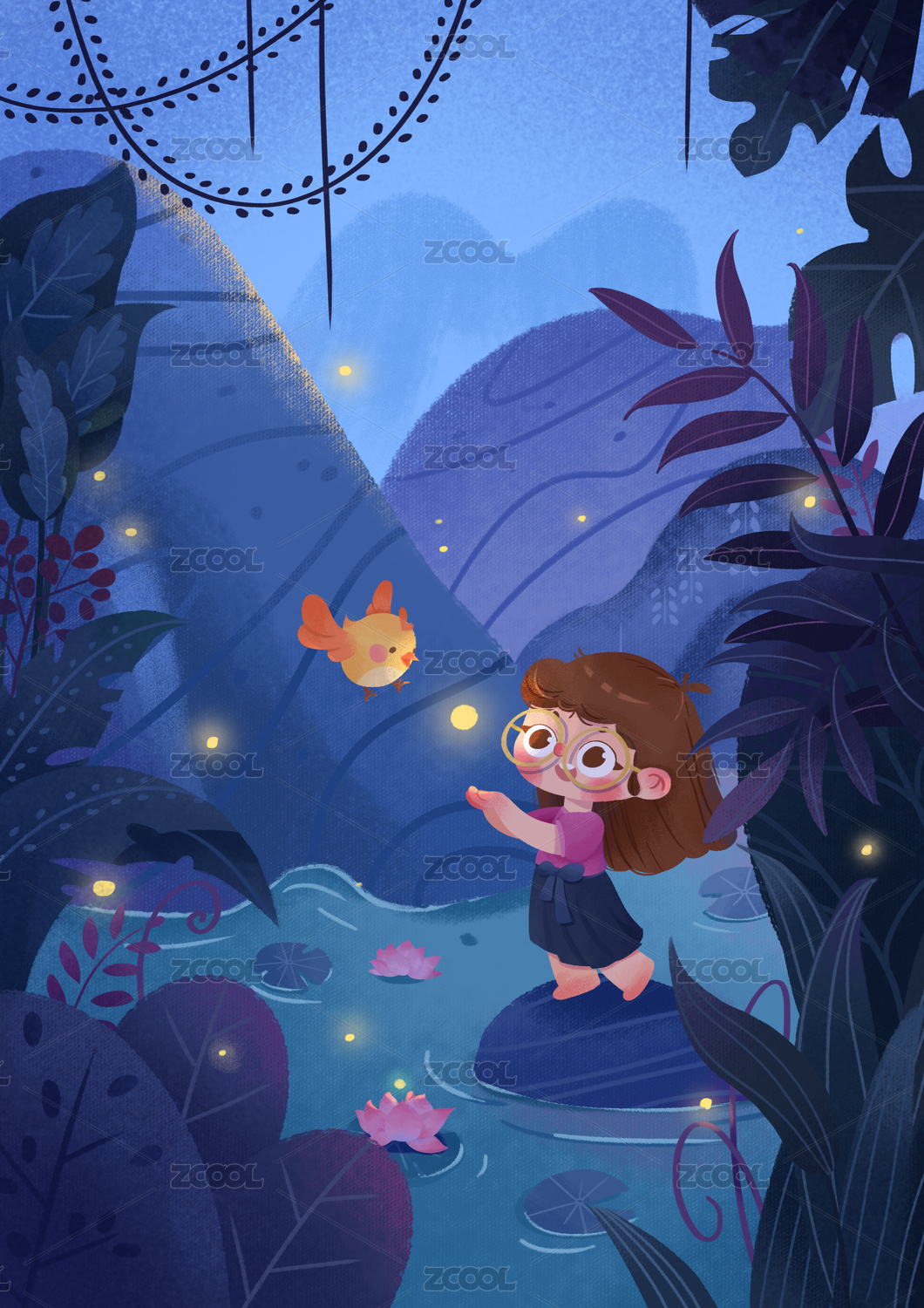 小女孩追尋螢火蟲回家的夢幻唯美插畫