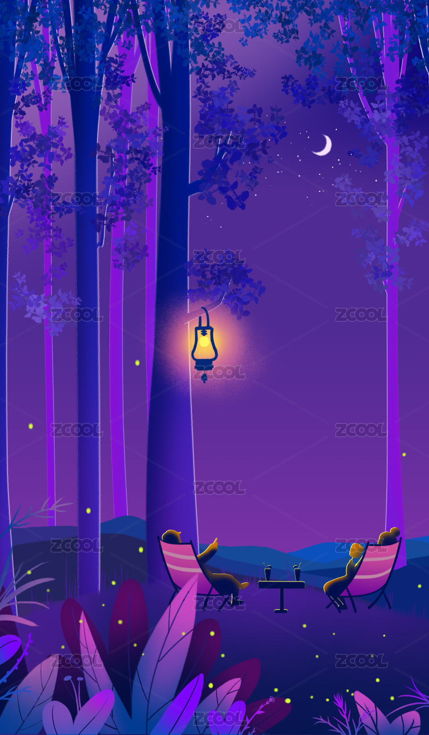 夏天螢火蟲的夜晚乘涼的情侶漸變插畫