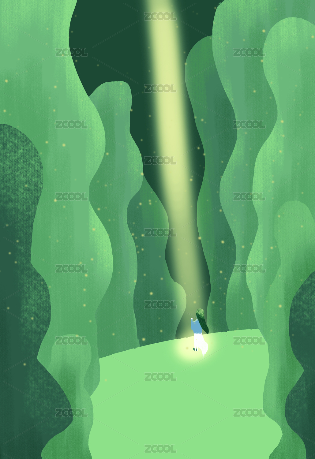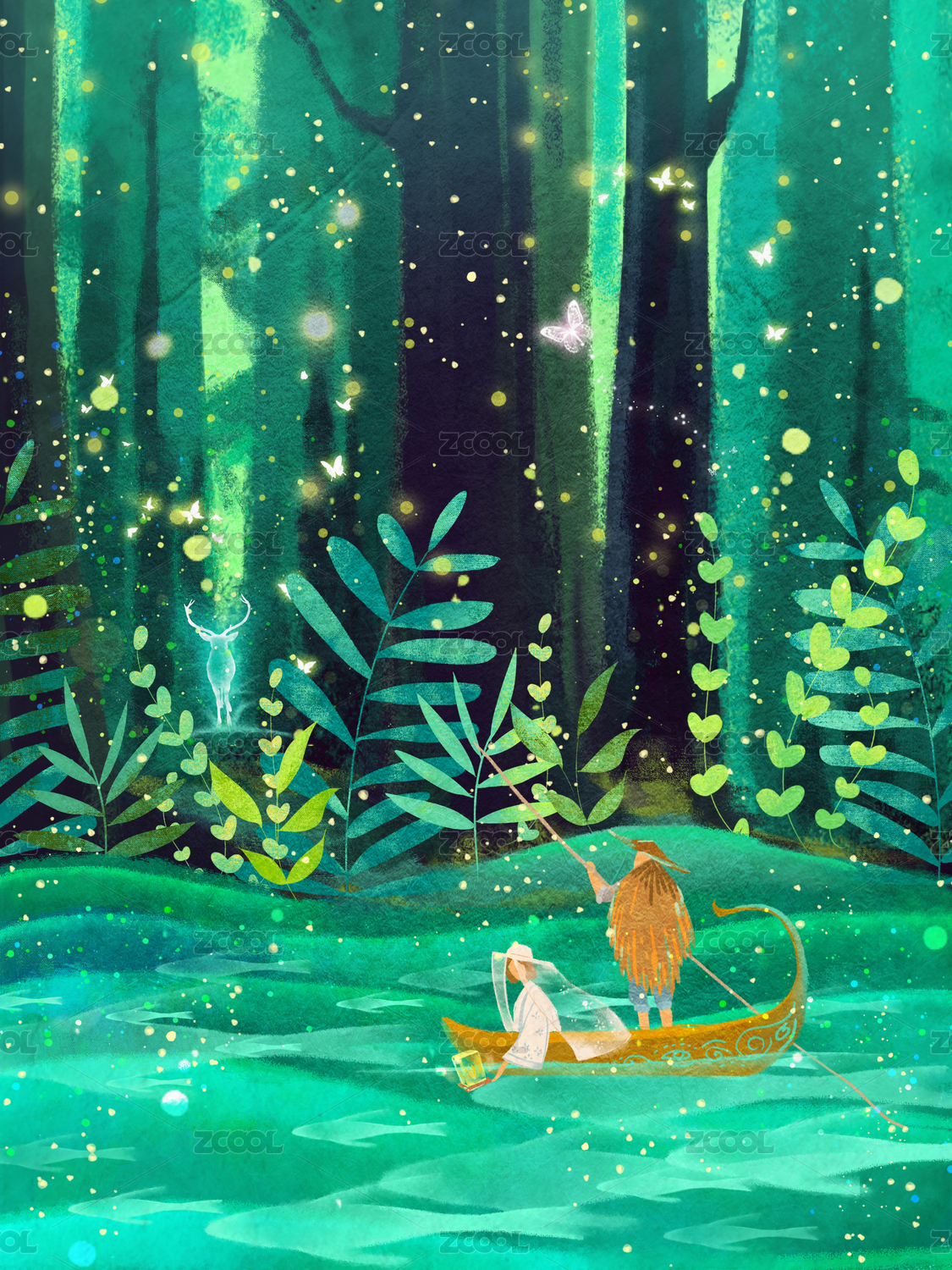 夏季仲夏夜森林深處閃耀著靈鹿的微光,螢火蟲在飛舞,蔥茂的植被閃著河水的光亮,河上有著一片孤舟,放河燈的人們放下他們的思念和希望