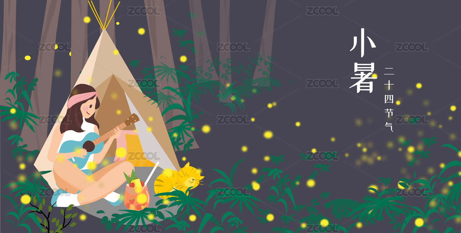 夏天的夜晚樹下女孩與螢火蟲的互動