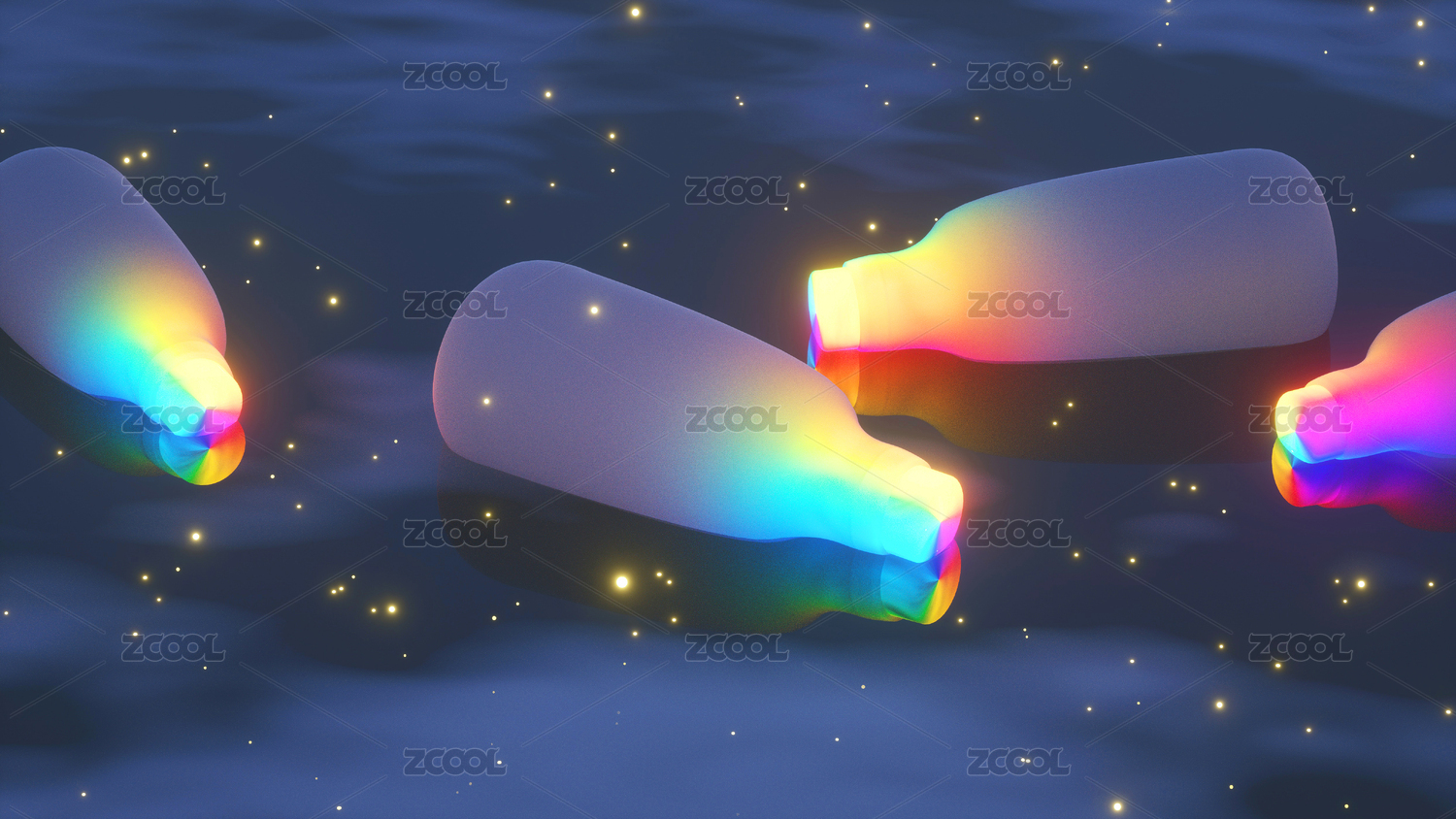 夜晚冰面上的彩虹色發(fā)光漂流瓶和螢火蟲
