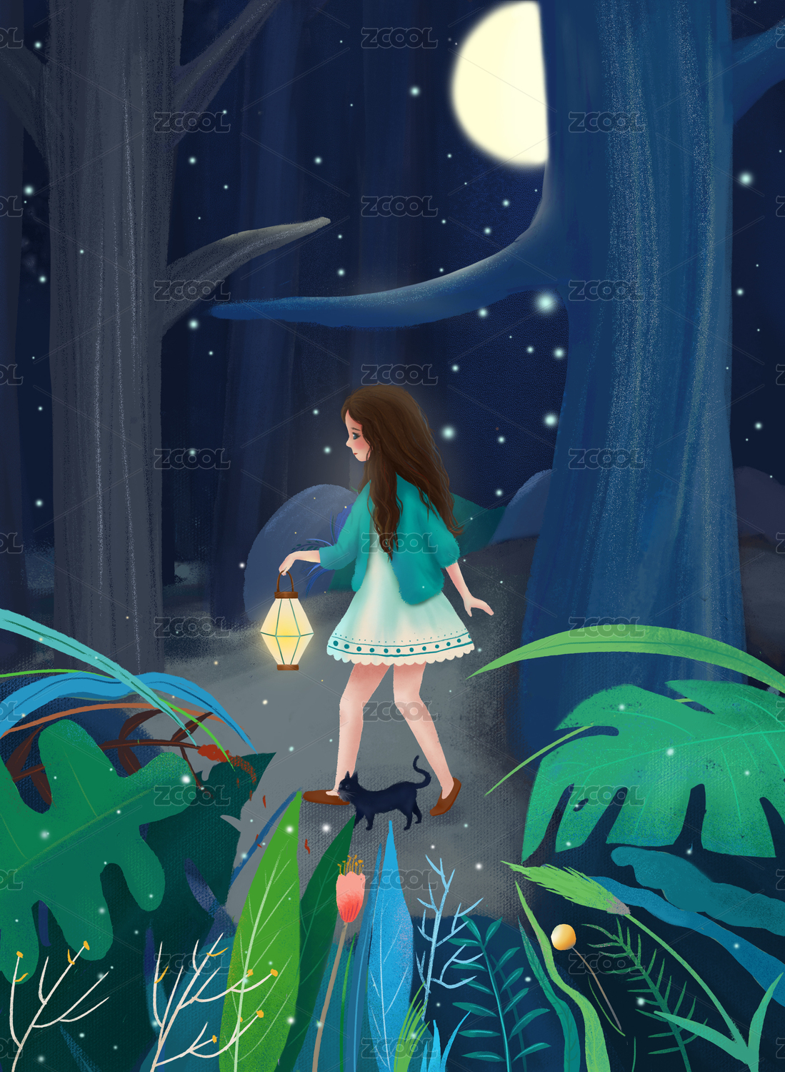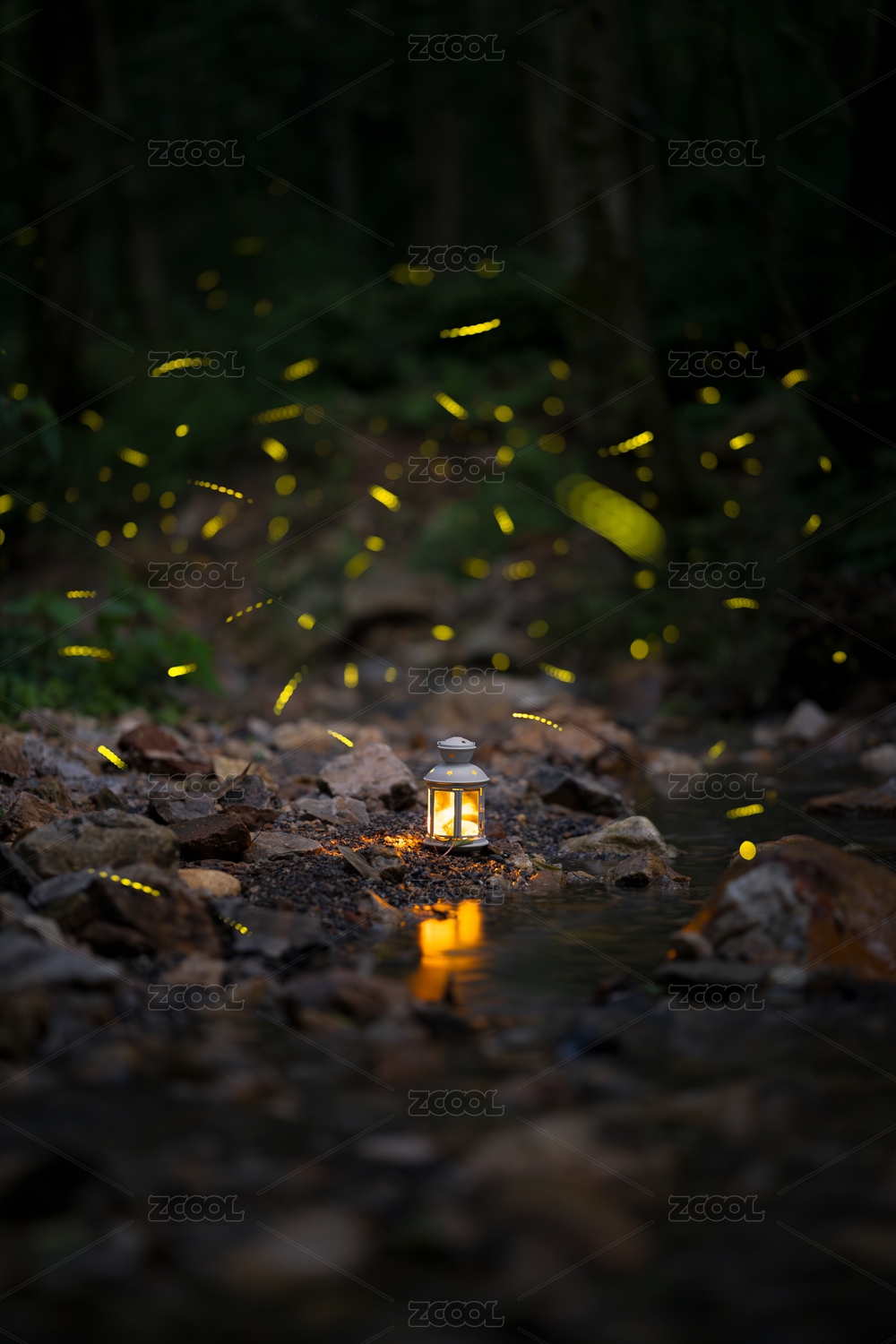 夏天夜晚漫天螢火蟲森林里提燈女孩