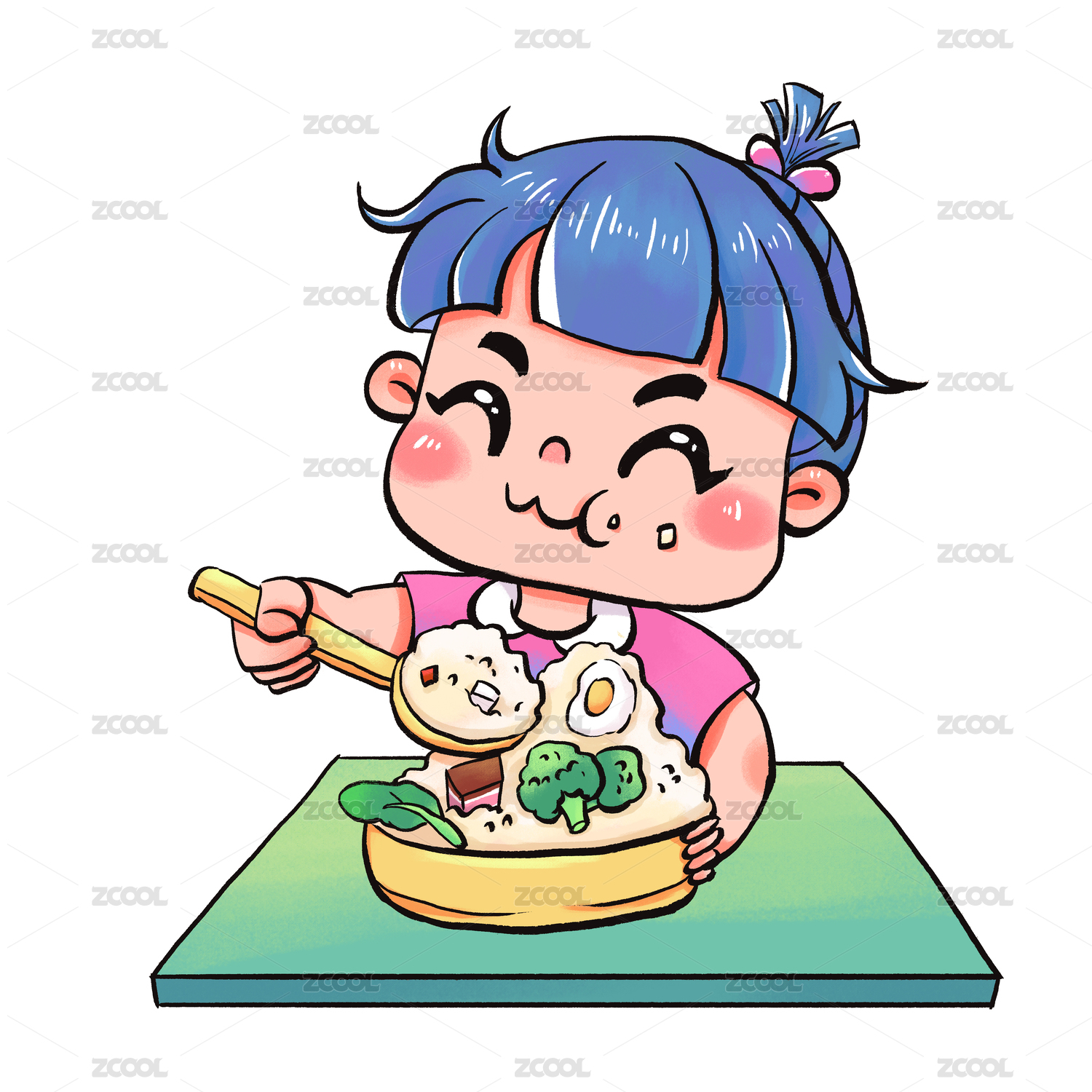 吃貨女孩坐在桌子旁吃雞腿蛋糕火鍋等美食