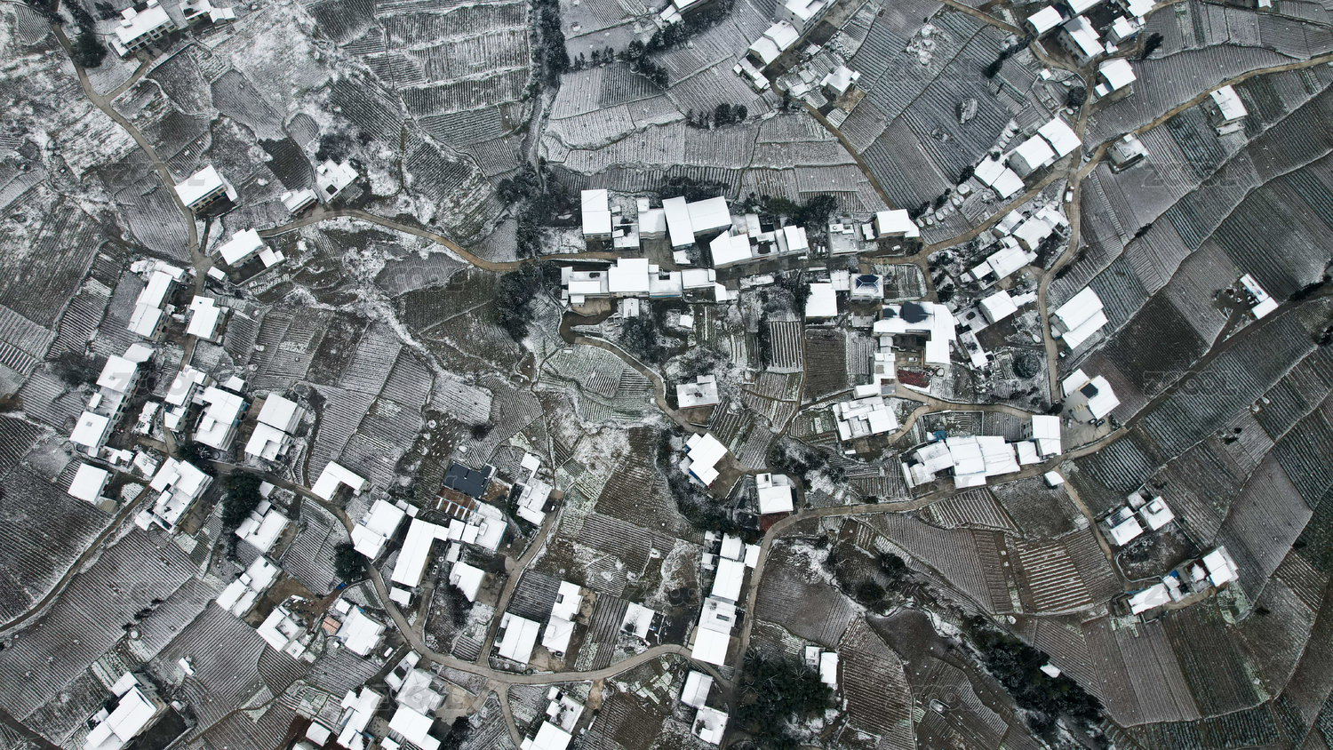 寒潮冬天下雪的村莊田野航拍