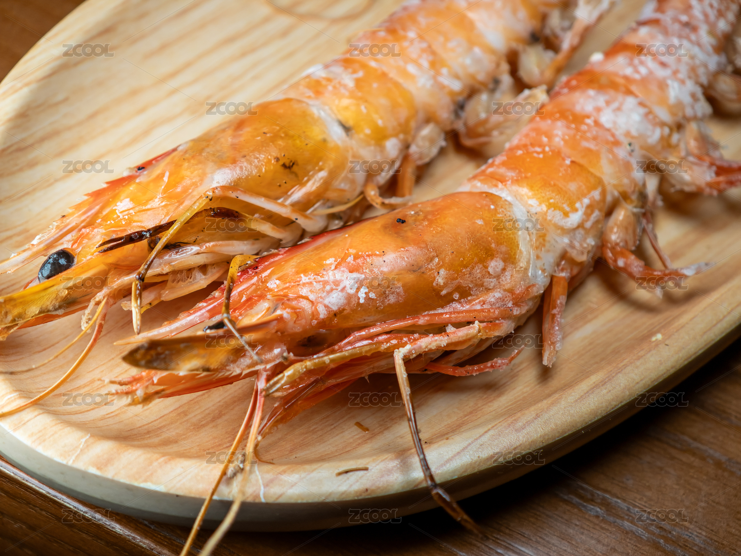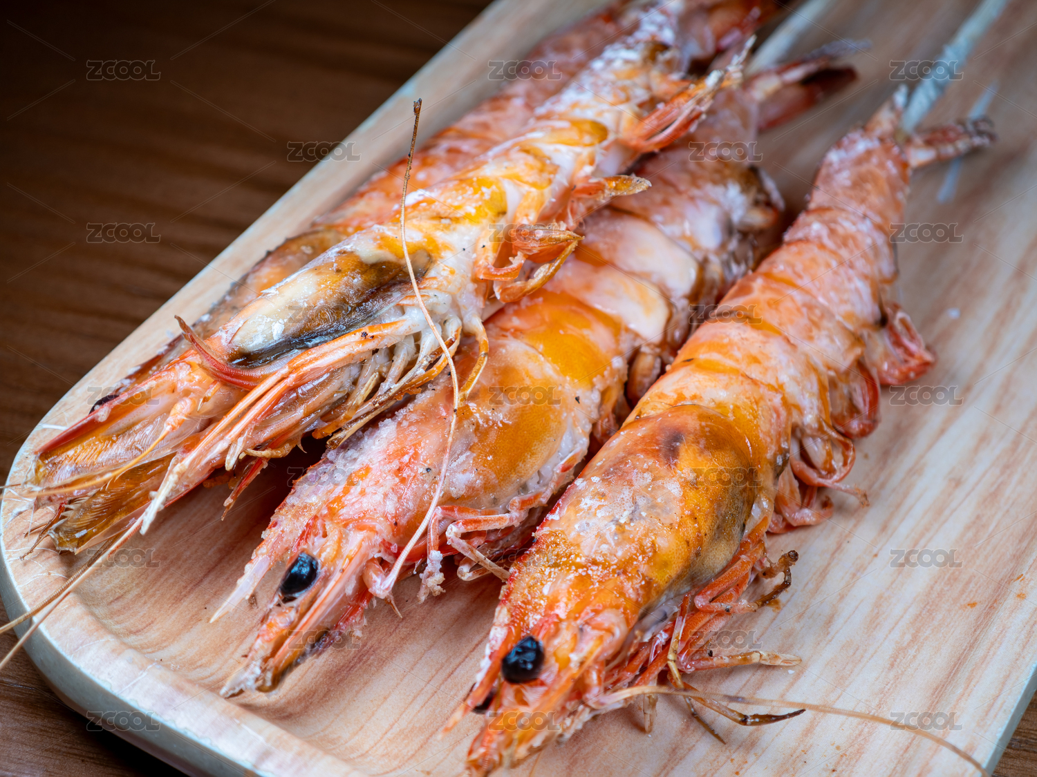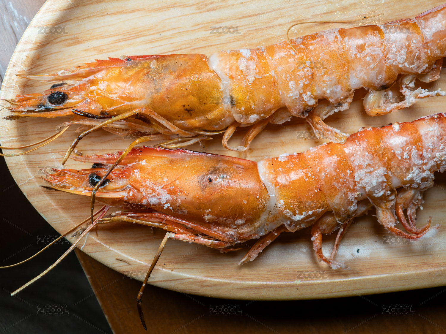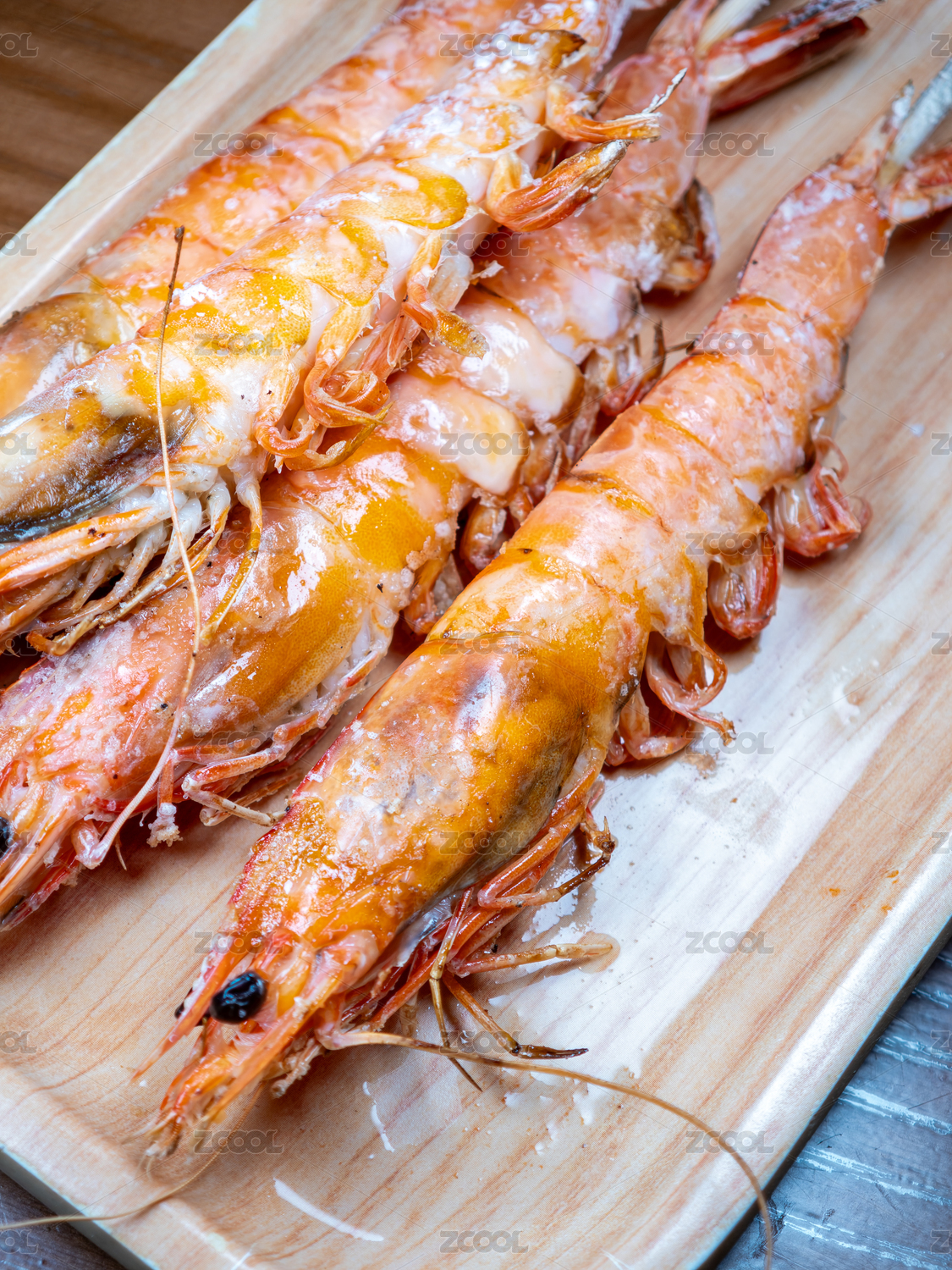木盤上的鹽烤蝦