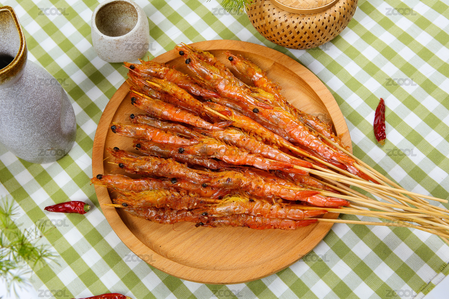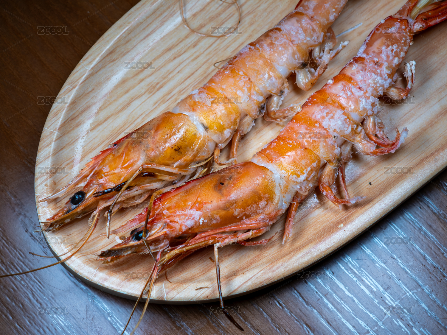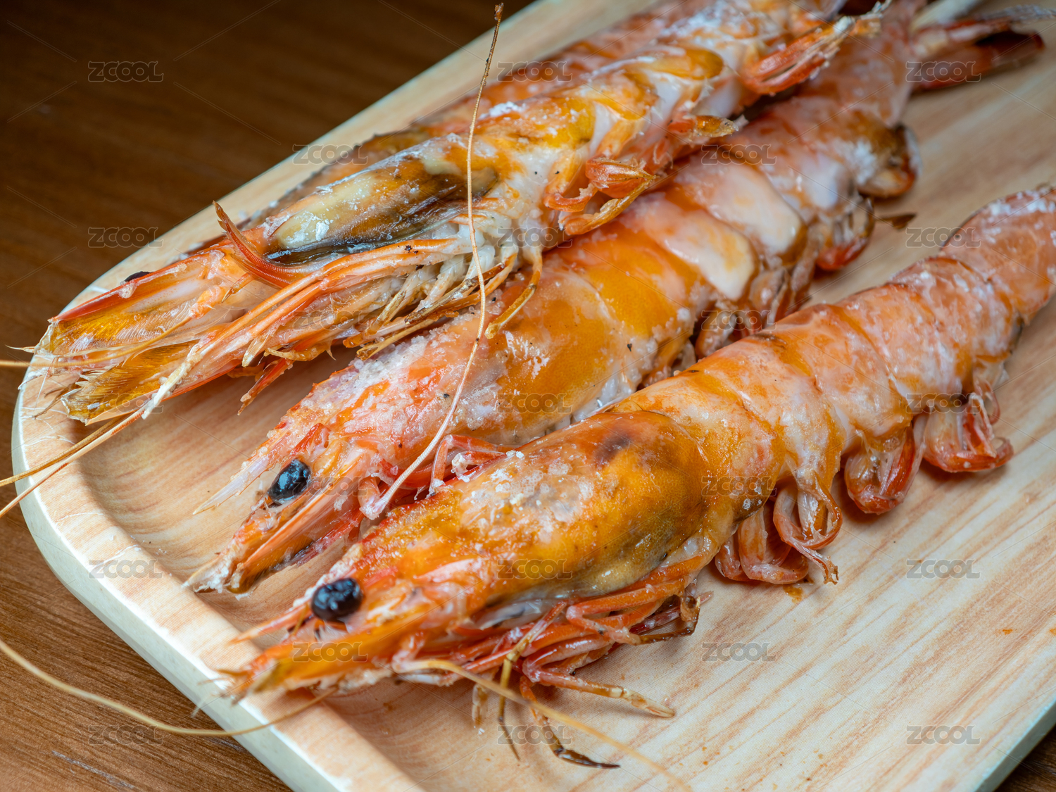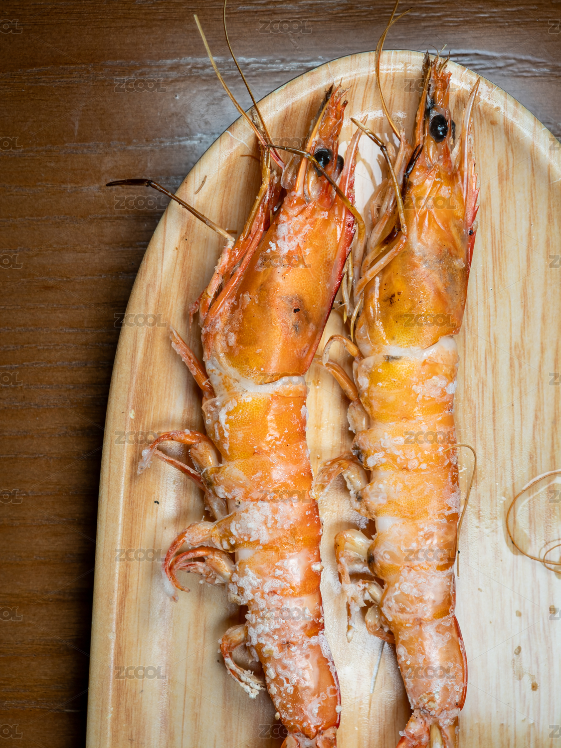 木盤上的鹽烤蝦
