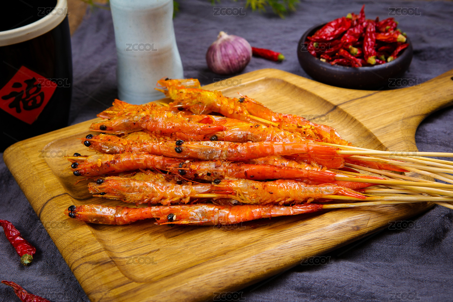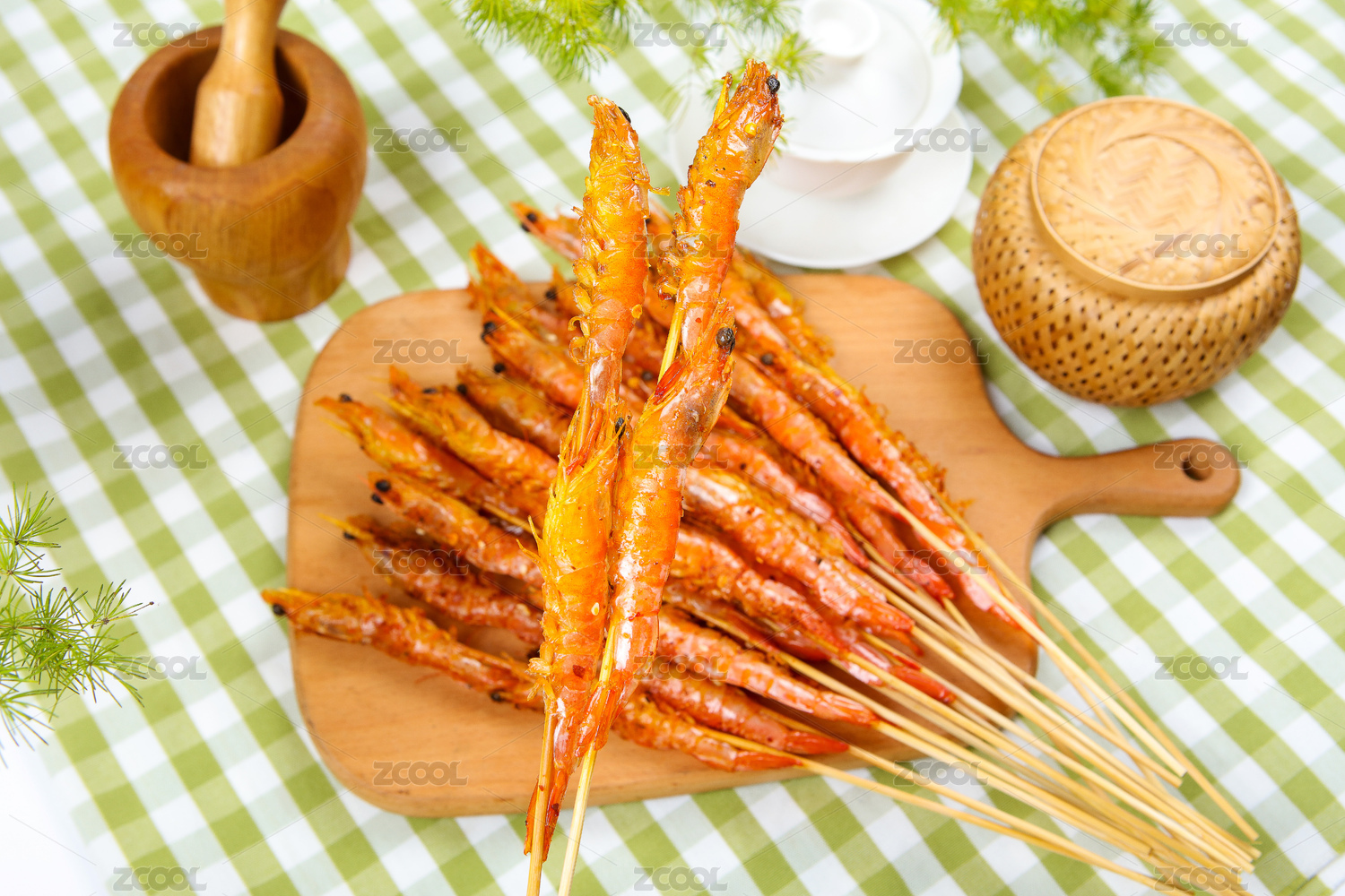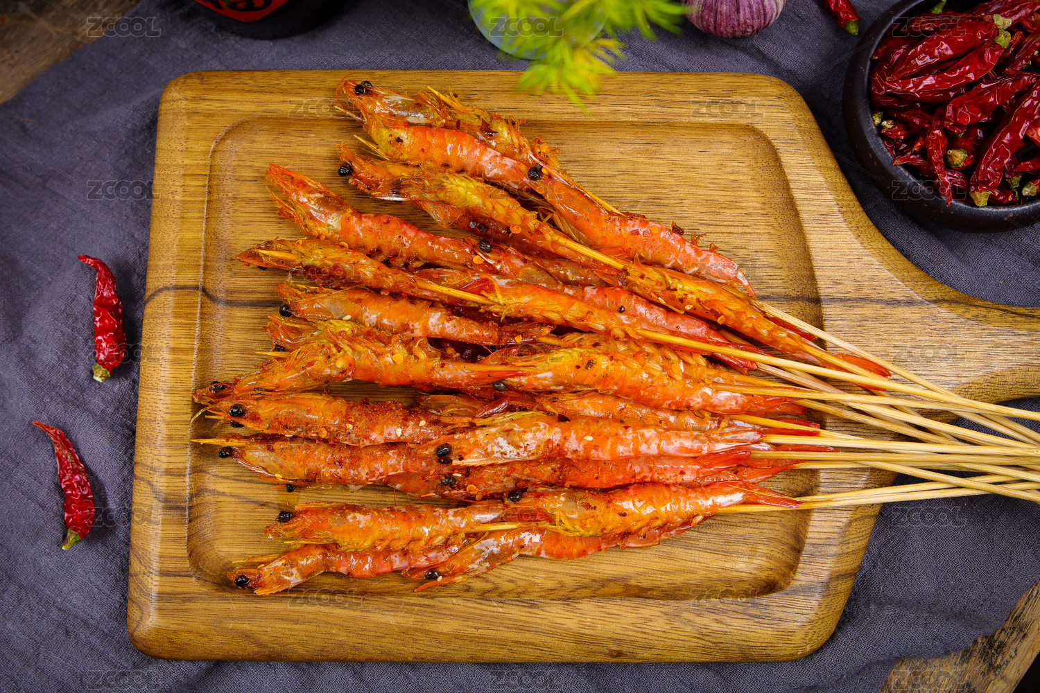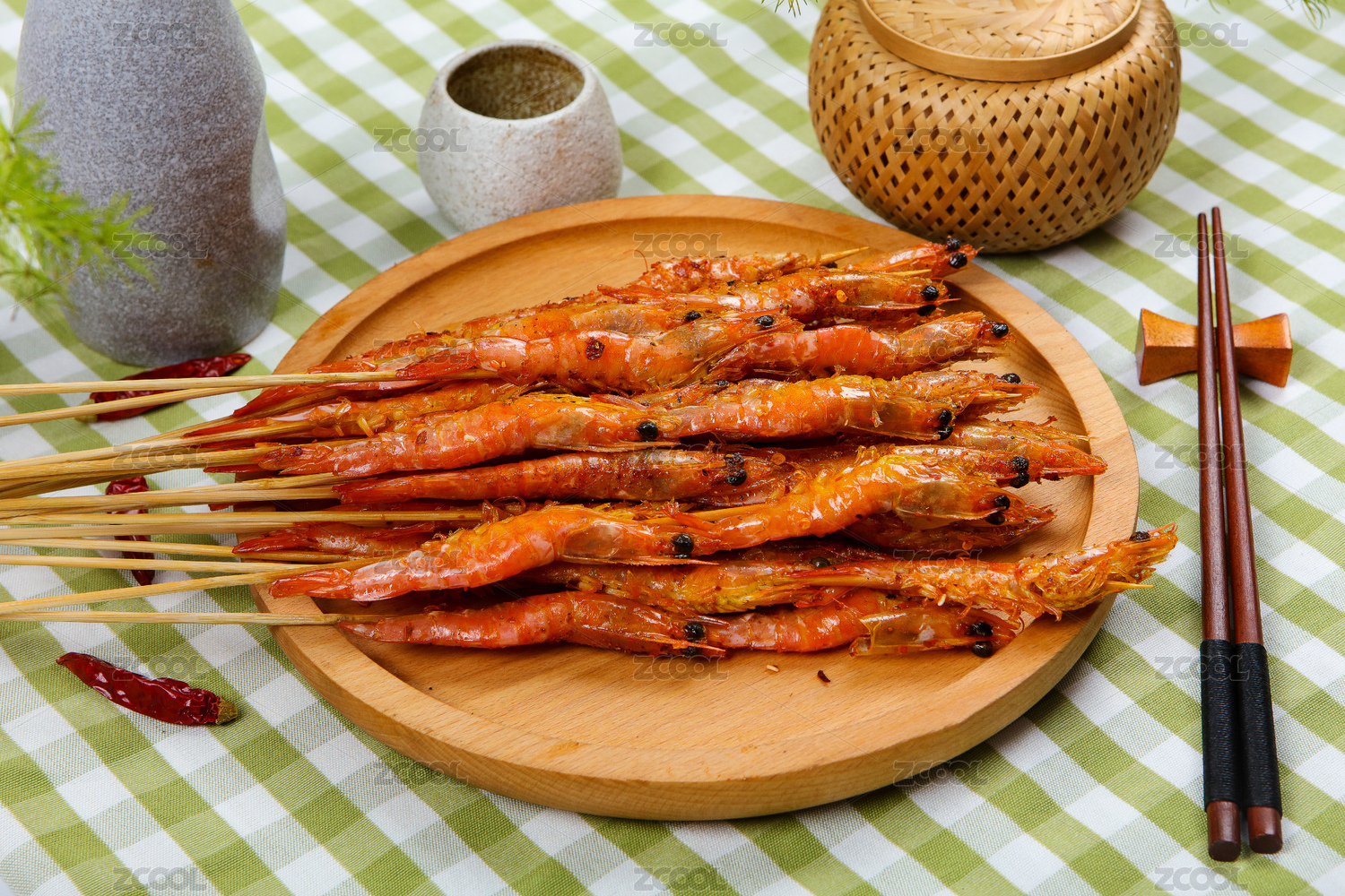 木盤上的鹽烤蝦
