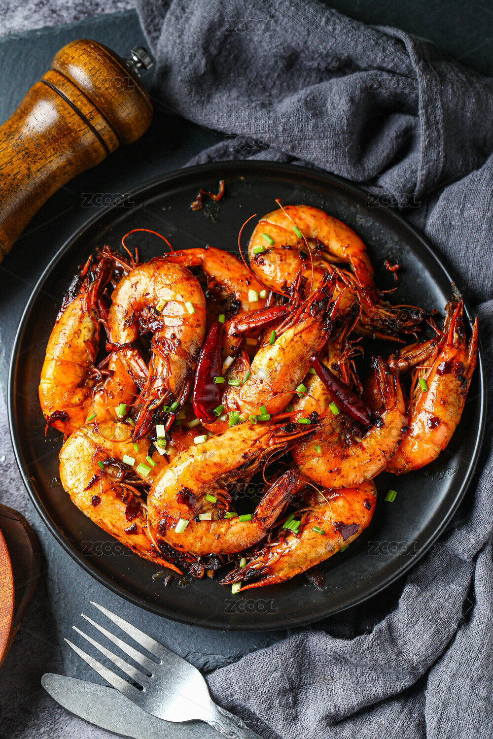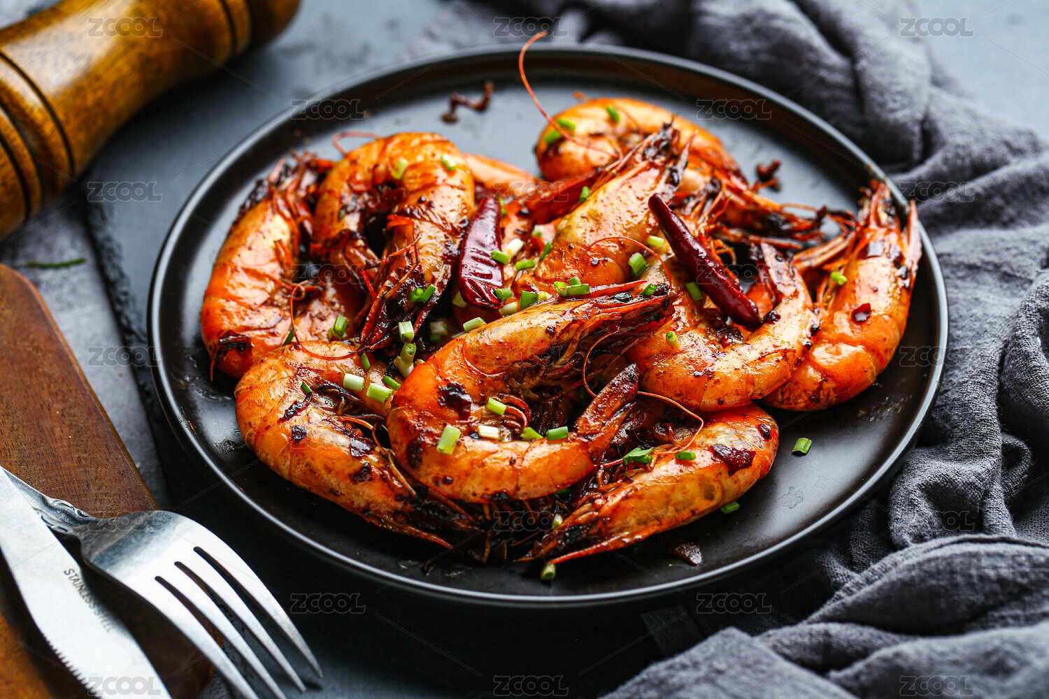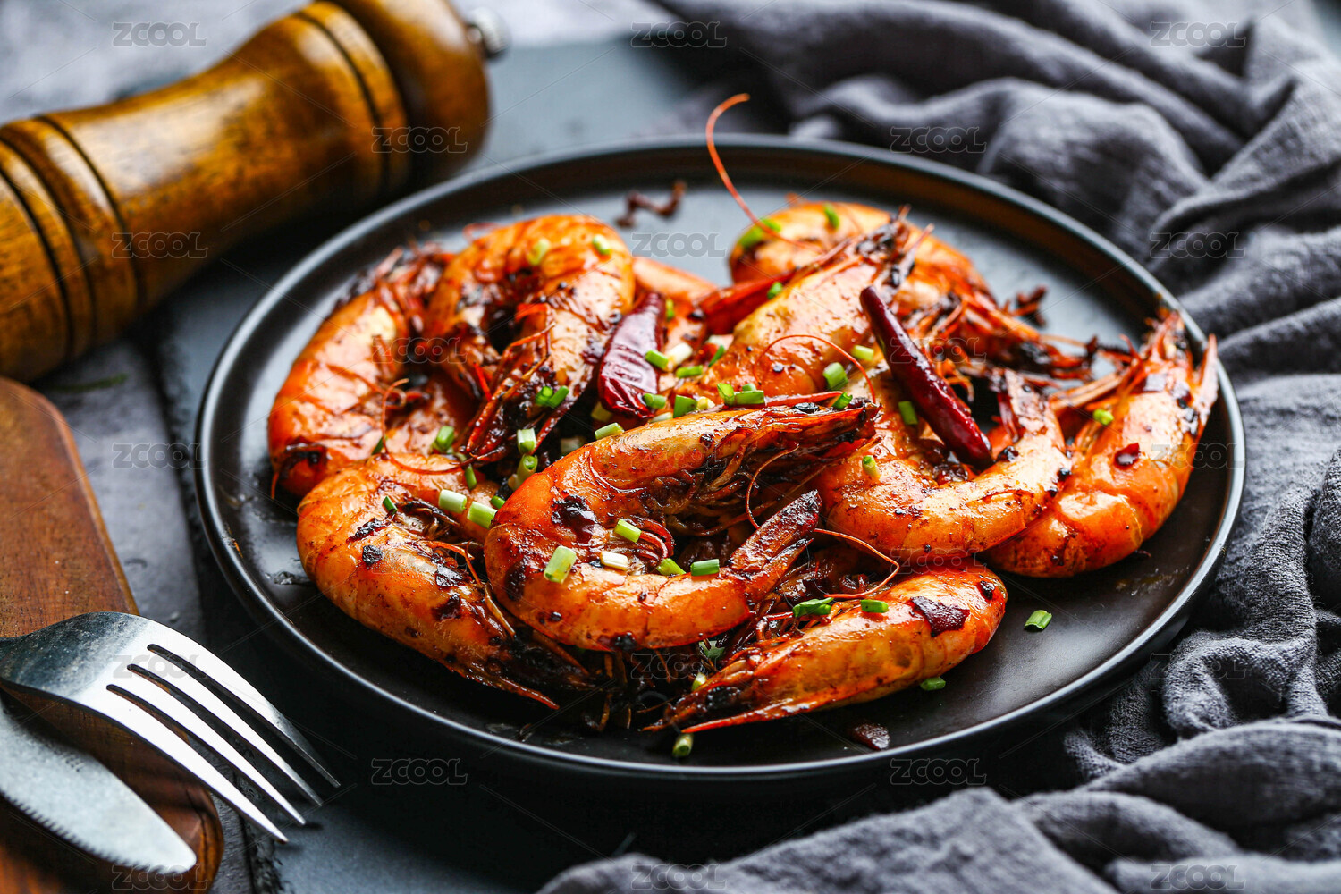 黑色盤子中的烤蝦
