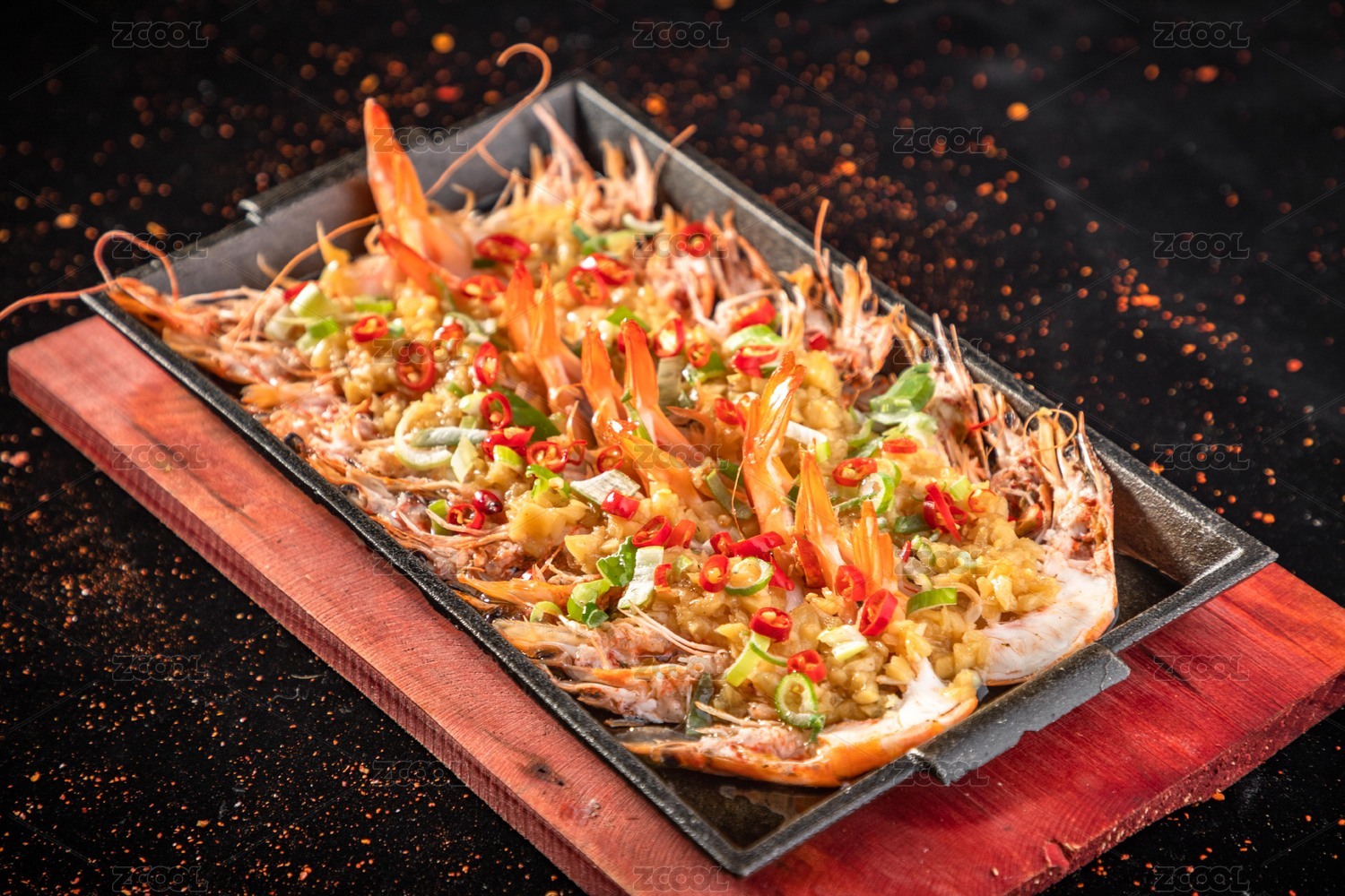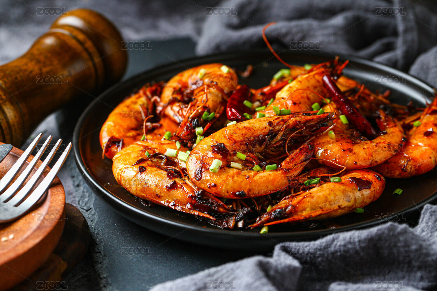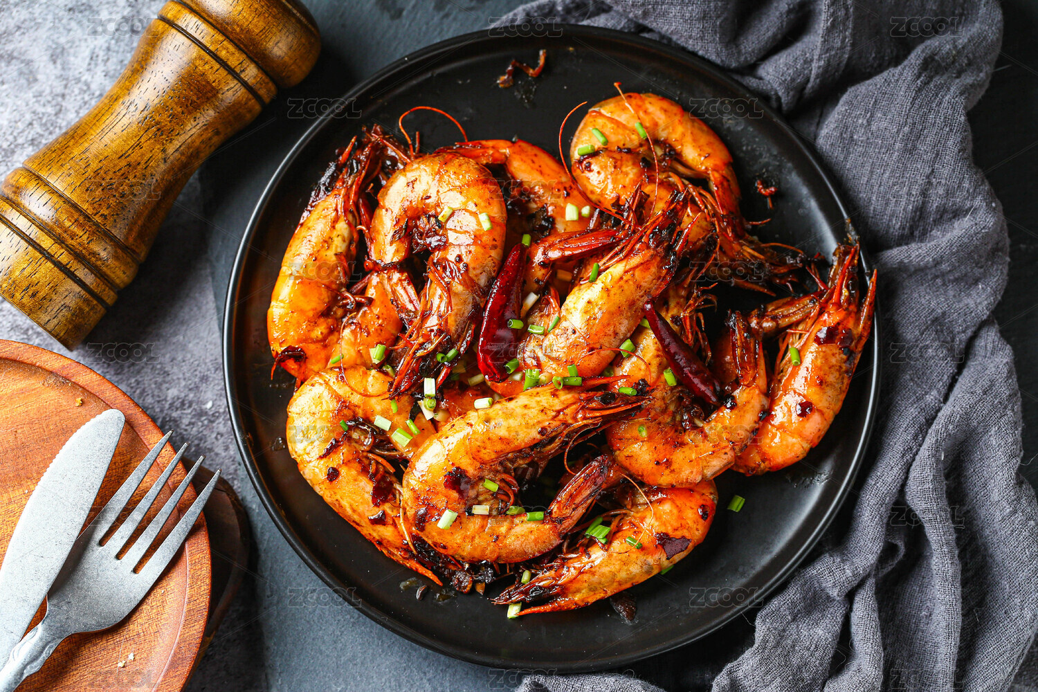 黑色盤子中的烤蝦