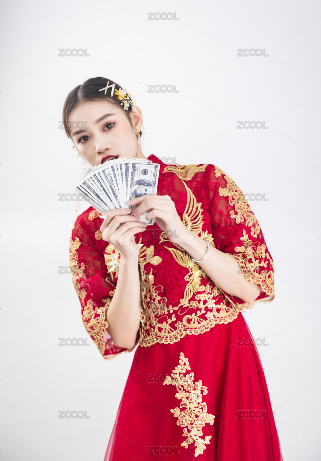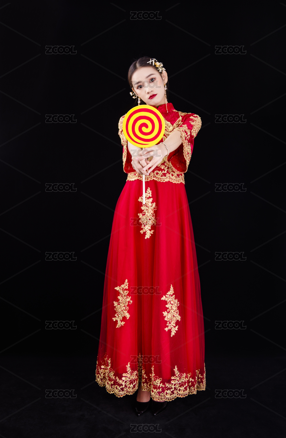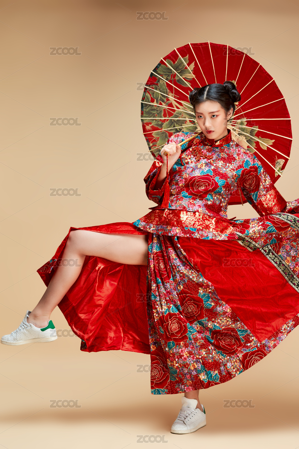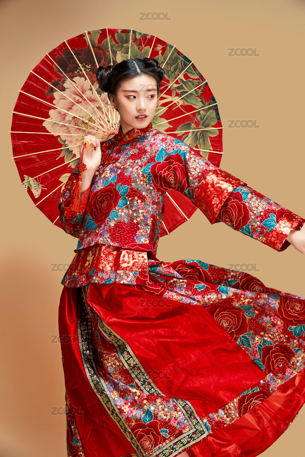身穿中國(guó)秀禾服手撐油紙傘的亞洲女性模特