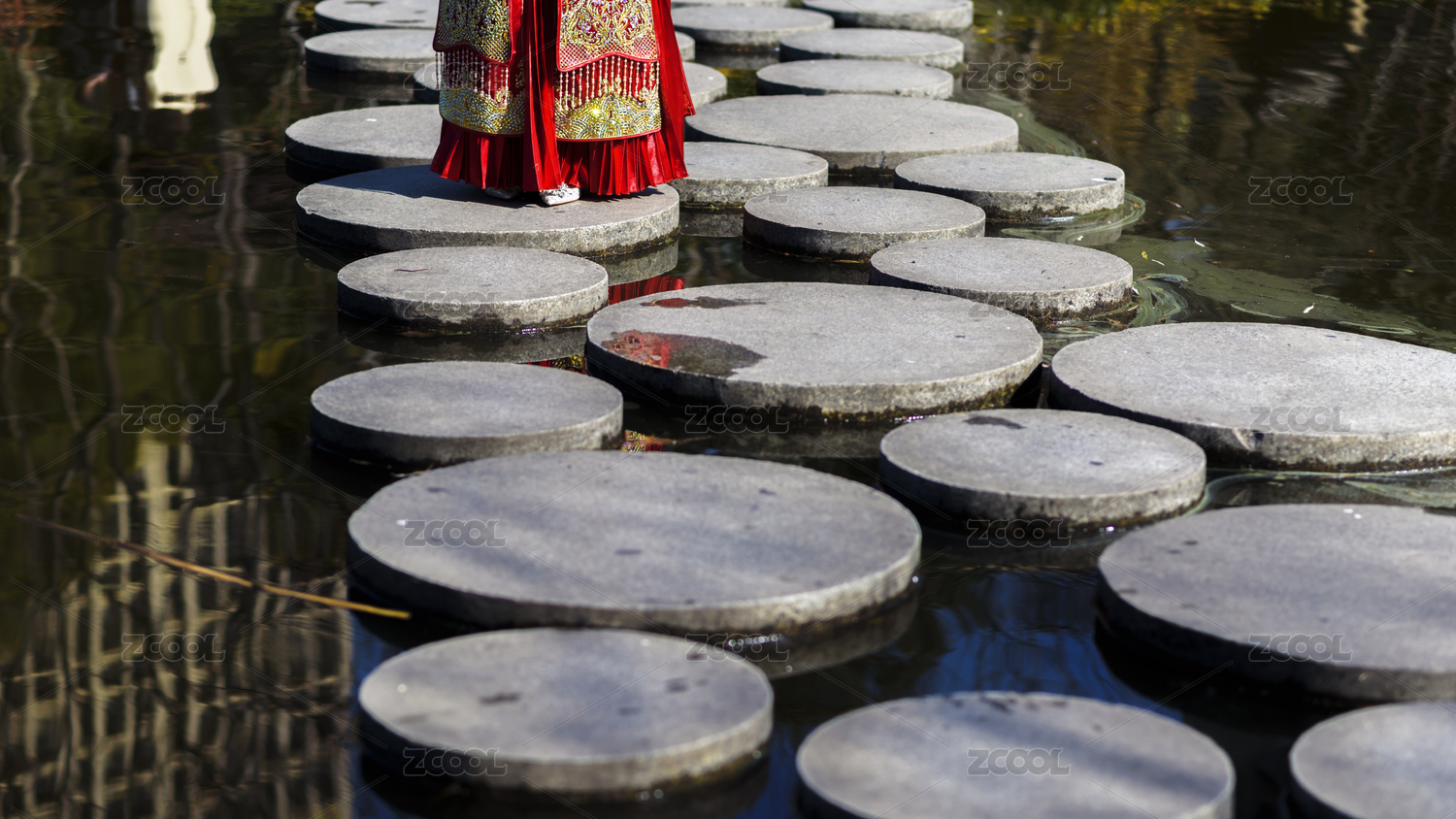在湖邊的女人穿著傳統(tǒng)服飾走路特寫