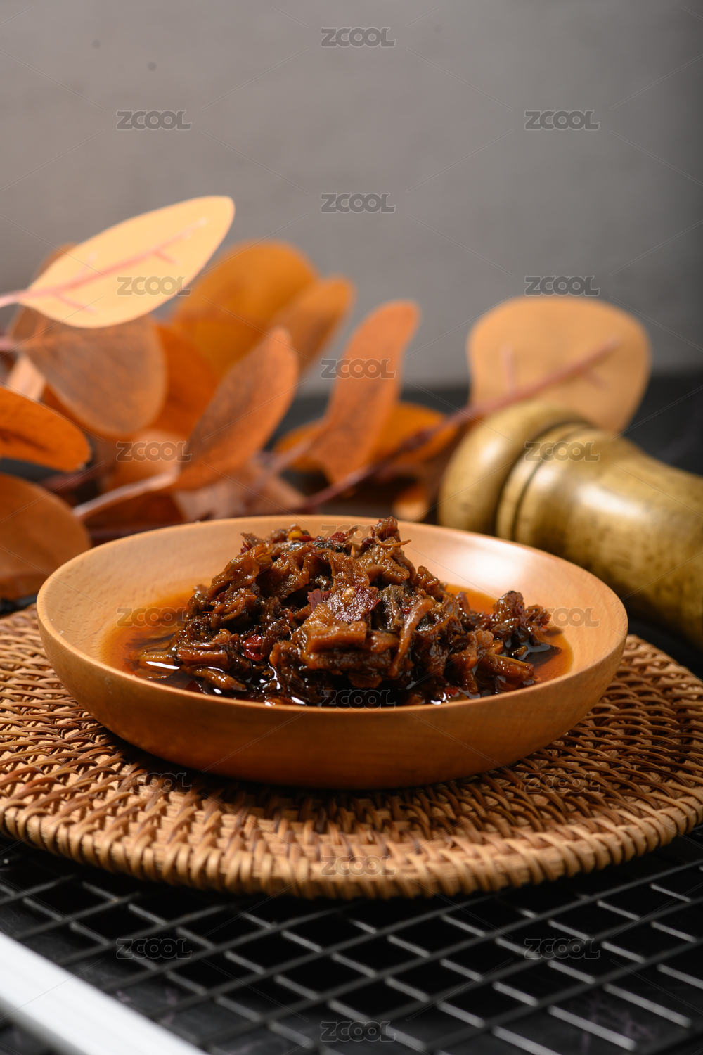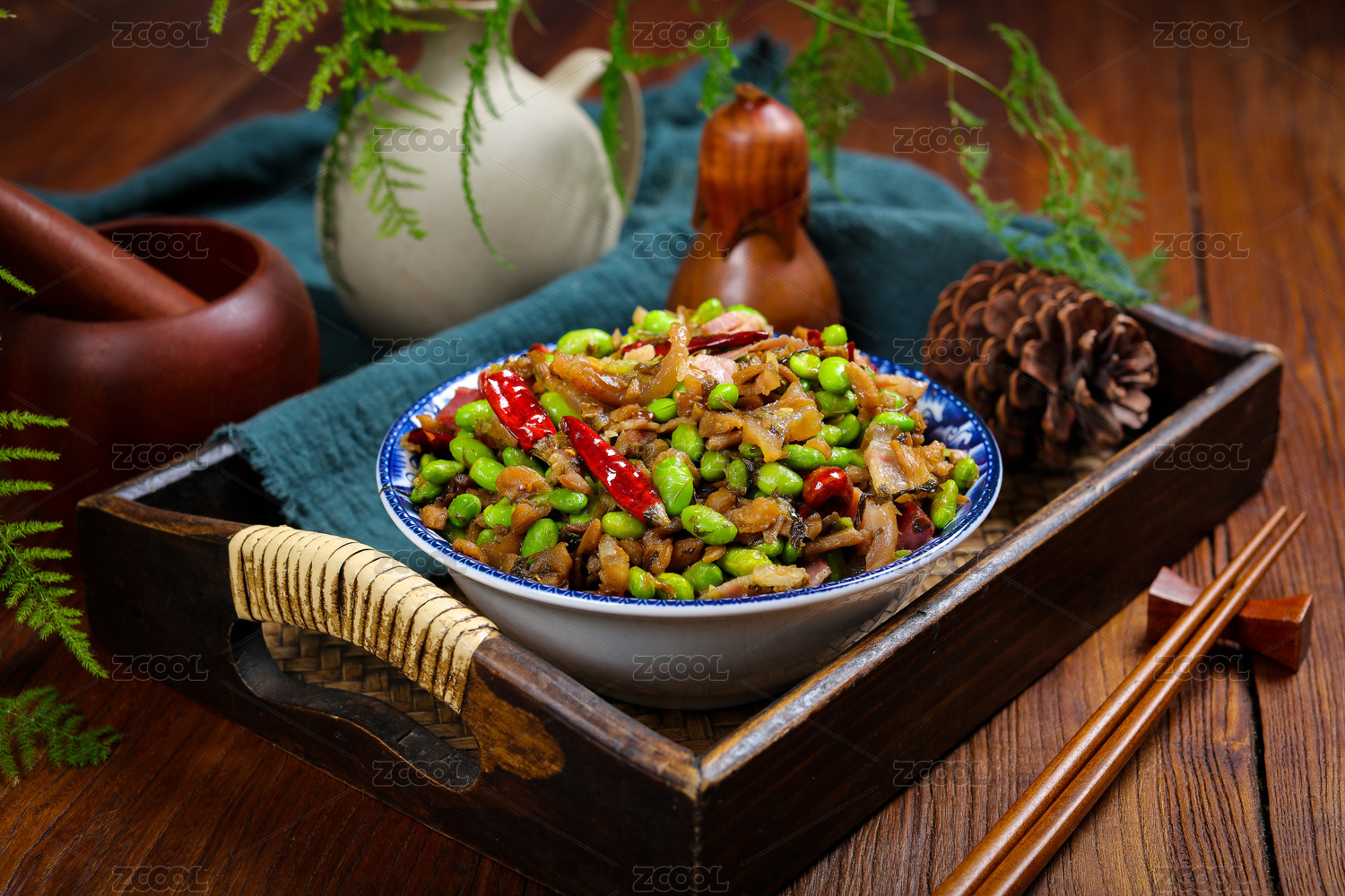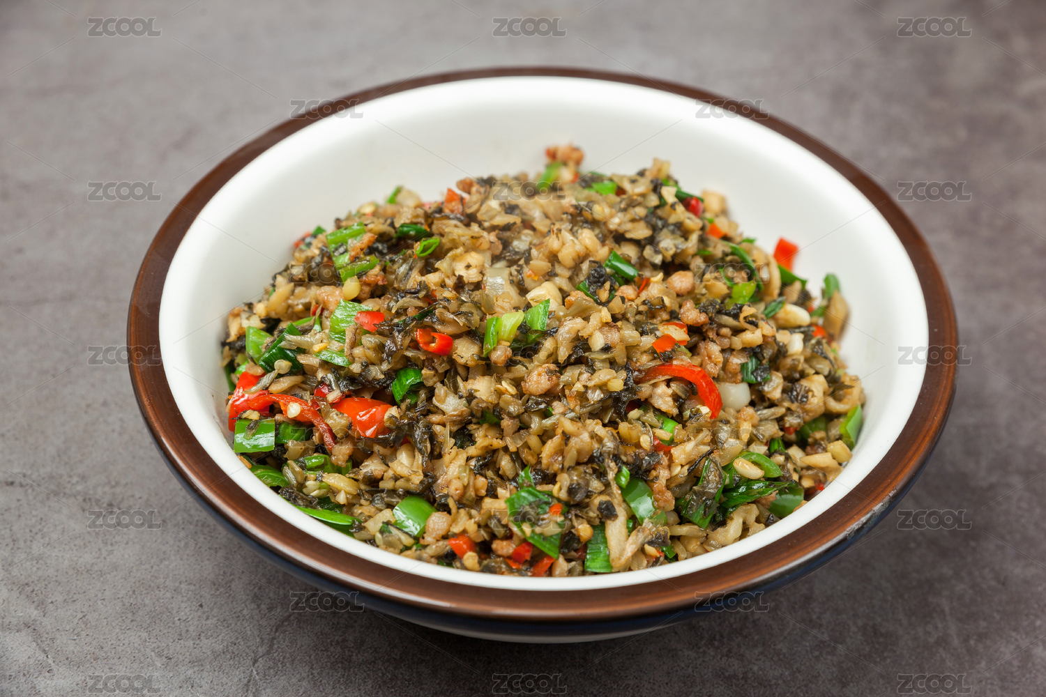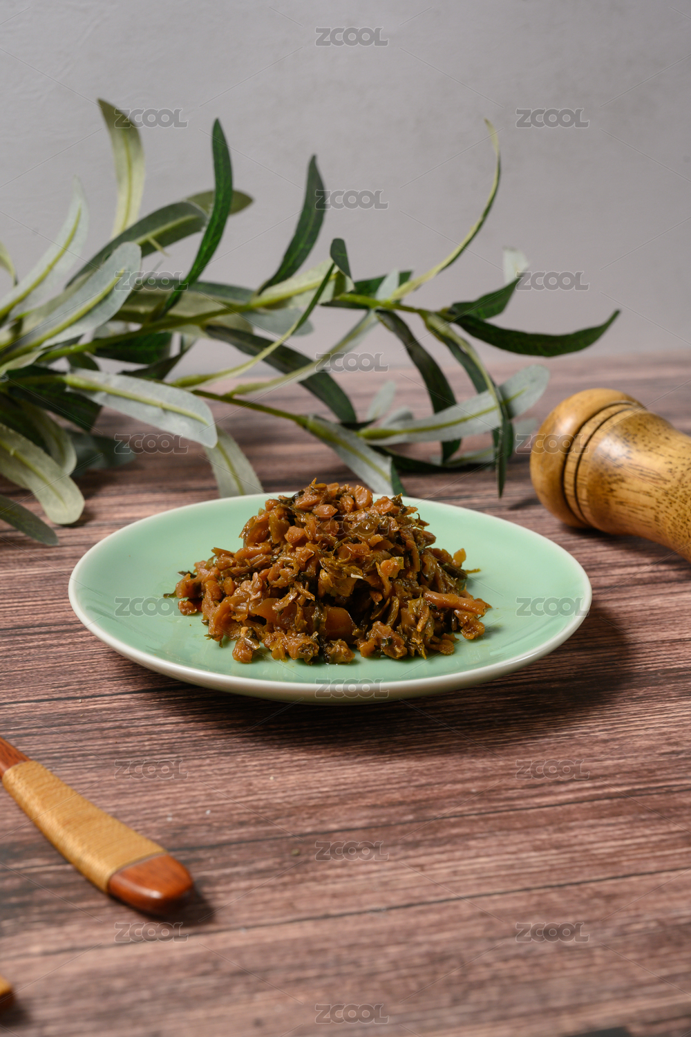 家常菜黃豆炒外婆菜盛放在白瓷盤中