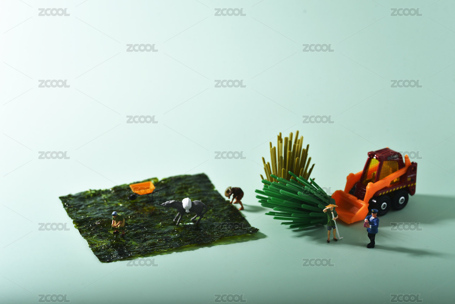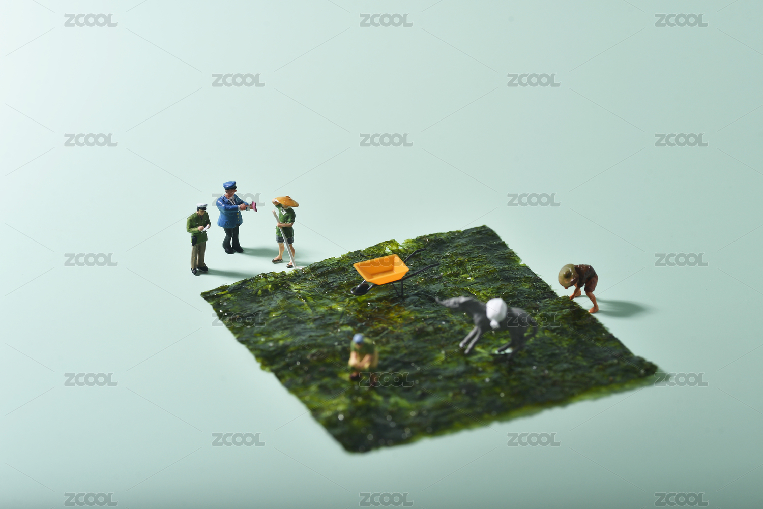 青色背景上的海苔和微縮創(chuàng)意小人保護耕地