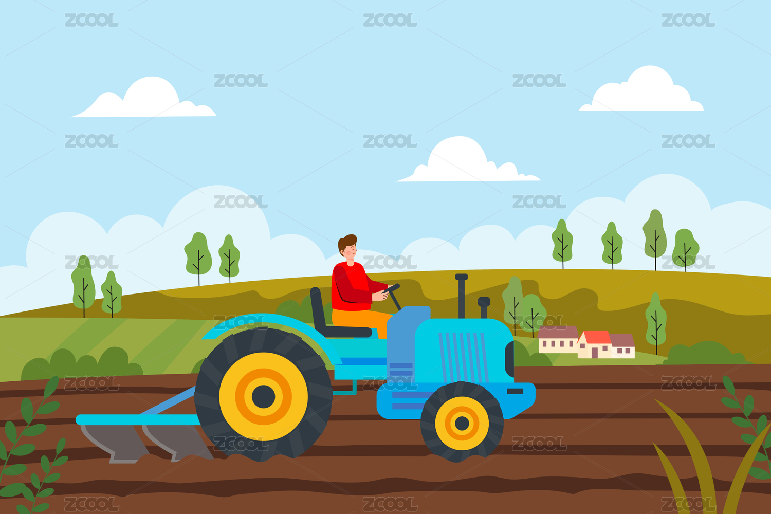 農民開拖拉機耕地矢量插畫