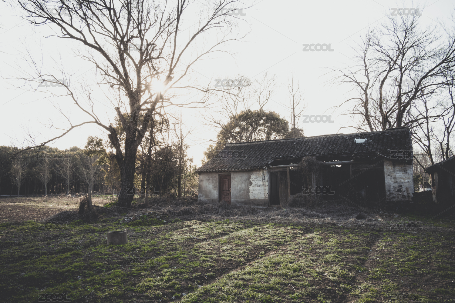 鄉(xiāng)村農村農田耕地枯樹破瓦房鬼屋枯井日光照