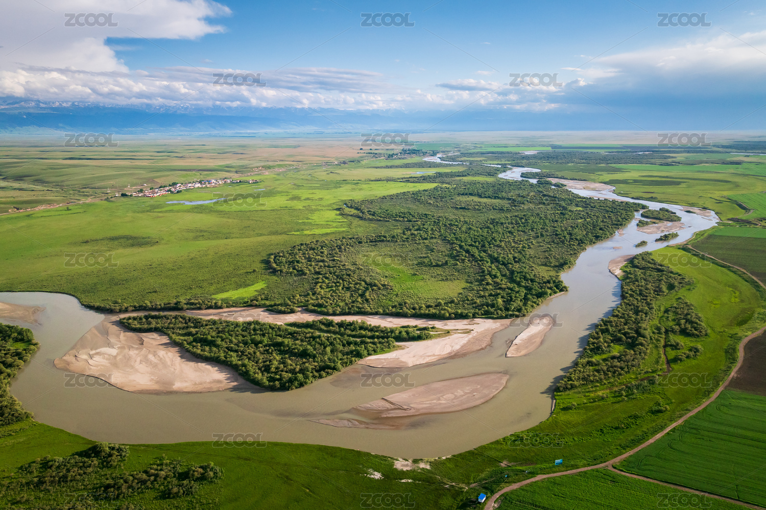 中國(guó)新疆伊犁昭蘇濕地公園特克斯河航拍風(fēng)光