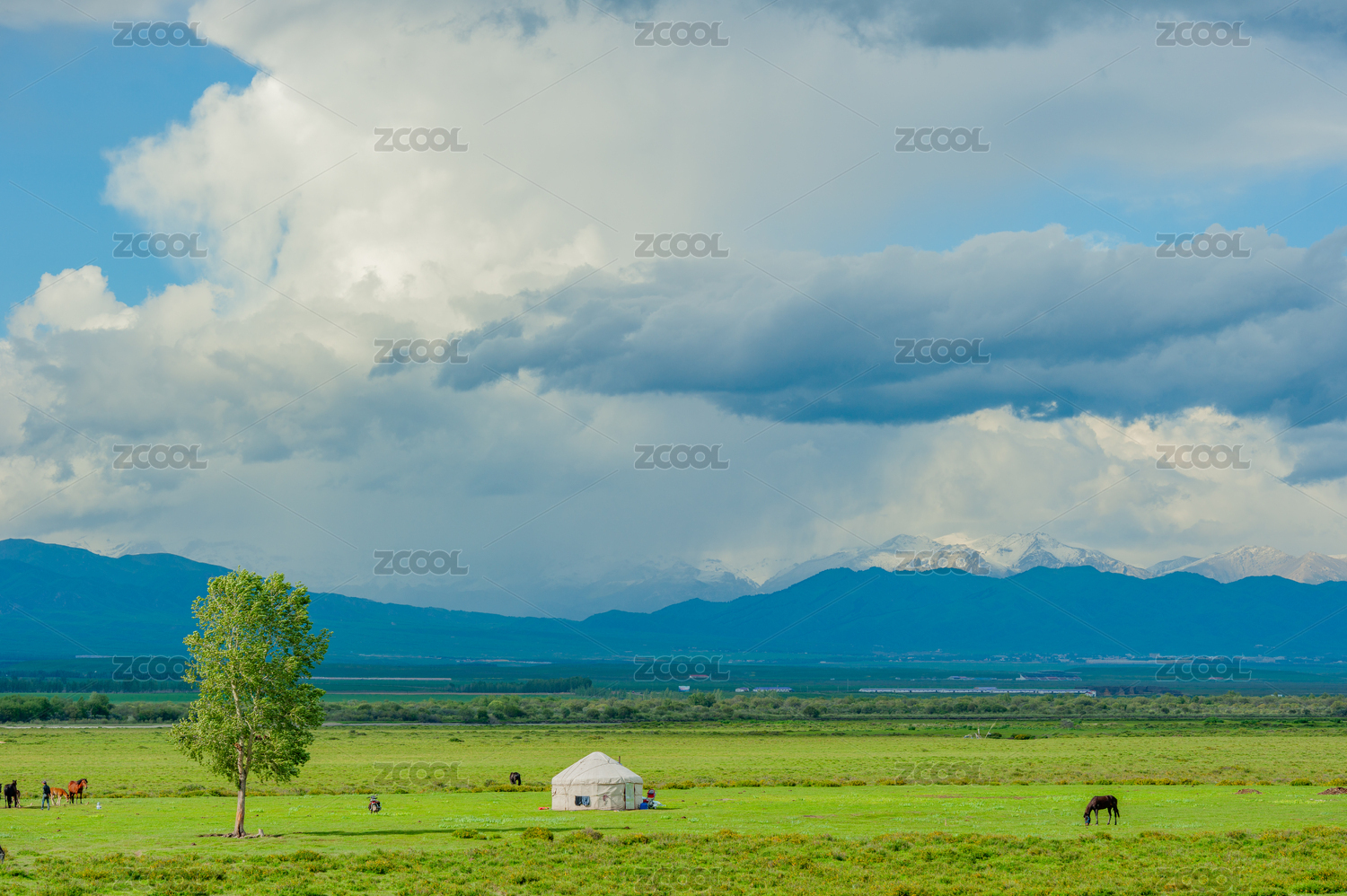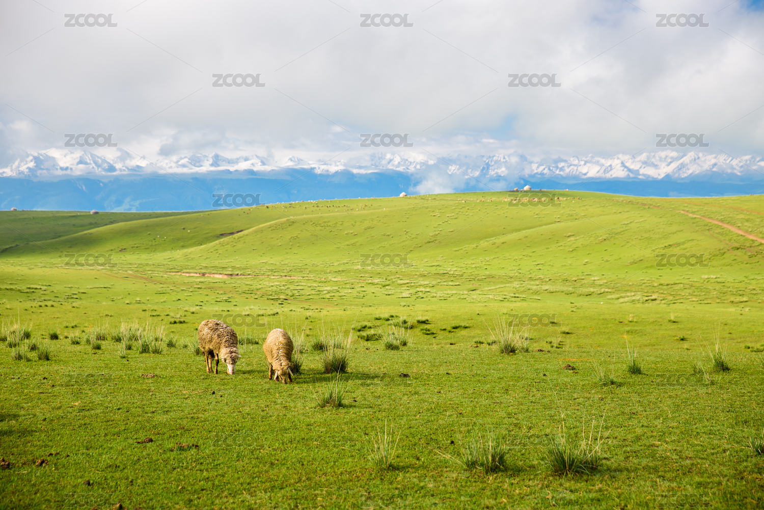 中國(guó)新疆伊犁昭蘇縣的草原牧場(chǎng)與遠(yuǎn)處的雪山